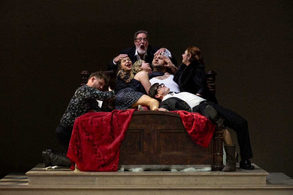 Tout colle, tout vit dans ce triptyque dont Christof Loy, le metteur en scène, a habilement modifié l’ordre des œuvres, épousant par là-même les trois parties de la Divine Comédie de Dante, grand inspirateur de Puccini. L’Enfer, avec la cupidité des Florentins avides d’héritage, le Purgatoire avec le trio amoureux prisonnier de ses démons et le Paradis grâce à la libération de la Vierge et l’expérience du sacré, débarrassé des scories de l’existence. Il faut dire que le reste de la distribution est de haut vol, autant du point de vue vocal que de l’incarnation dramatique. Misha Kiria, baryton géorgien a la voix puissante et au physique imposant, est un génial Gianni Schicchi, autoritaire et roublard, qui se retrouve dans le lit du défunt pour contrefaire le mort et modifier l’héritage. Dans l’espace dénudé d’une immense chambre trône un lit monumental, véritable pot de confiture autour duquel tous s’agitent. La vieille Zita, incarnée par la formidable Enkelejda Shkoza, que l’on retrouve également dans les deux autres œuvres, et son neveu Rinuccio, que chante le merveilleux ténor russe Alexey Neklyudov, mais aussi Lavinia Bini, Manel Esteve Madrid, Scott Wilde ou Theresa Kronthaler, emportés dans un tourbillon scénique à la vivacité trépidante, véritable comédie à l’italienne qui déraille joyeusement et cruellement, pour notre plus grand plaisir.