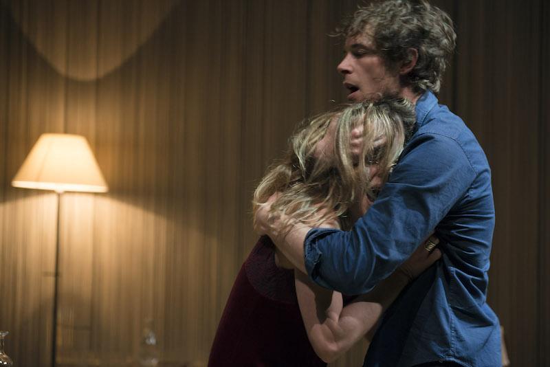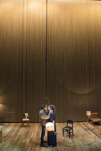 Autant prévenir d’emblée, c’est à une expérience particulière à laquelle on assiste en pénétrant dans la salle des Ateliers Berthier de l’Odéon. On est prié de prendre place et d’attendre sagement la première mi-temps, c’est à dire d’assister aux ébats, ou à l’attente, de Pénélope ou de Calypso, l’une désespérée et inconsolable, l’autre séduisante et croqueuse d’hommes, selon qu’on est placé d’un côté ou de l’autre de la scène bi-frontale. Au milieu, le filet, c’est à dire un superbe rideau de fils d’or évoque les silhouettes de l’autre rive, dont le héros, Ulysse, est le grand absent. Des cacahuètes, des verres vides, des carafes d’eau, des fauteuils clubs qui ont bien vieilli évoquent une fin de soirée bien arrosée, et les comédiens alanguis proposent même aux spectateurs des arachides et des chips. On fait la fête ? Ou on la digère, sans qu’il ne se passe grand chose d’intéressant sur le plateau. Pourquoi est-on là, au fait ? Ah oui, les comédiens français expriment soudain des témoignages de migrants arrivés sur le sol européen, avec leur lot de souffrances.