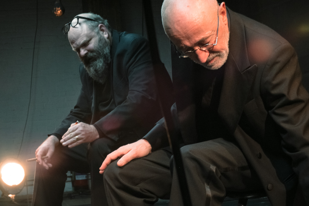 Ils sont face à nous, assis sur des chaises avec leurs costumes sombres et leurs souliers vernis. Des bouteilles d’eau et de bière trônent à leurs pieds, la conversation s’engage entre ces deux amis qui se retrouvent après une longue absence. Damiaan De Schrijver, carrure imposante et rire jovial, porte la barbe fournie et les mains généreusement ouvertes. Son acolyte, Matthias de Koning, est aussi sérieux que Buster Keaton, le visage impassible et le discours hésitant. Que se racontent-ils ? Le goût du risque, du danger, du déséquilibre pour l’Un, attiré par l’abîme de la mer et les gouffres du vent. Les hommes et le bruit l’ennuient, mais en même temps les mots le trahissent comme des pierres trop lourdes. L’autre, terrien et pragmatique, ne cesse de l’interroger, de lui faire préciser sa pensée, ses désirs. Pourquoi cette détestation des autres ? Des mots qui trahissent ? Du bruit qui meurtrit ? Ou aller ? Comment s’explique cette béatitude de solitaire alors que la vie est grouillante, partout, et que le vin est bon ?