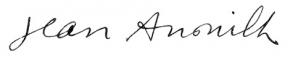 [Visuel : Signature, Jean Anouilh, French dramatist (1910–1987). From an undated Birthday letter to an unknown person.Date unknownSource www.icollector.com/Jean-Anouilh_i9617034 This signature is believed to be ineligible for copyright and therefore in the public domain because it falls below the required level of originality for copyright protection both in the United States and in the source country (if different). In this case, the source country (e.g. the country of nationality of the signatory) is believed to be France.]