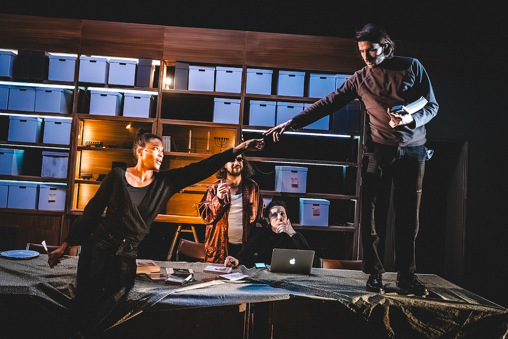 La réussite du spectacle tient justement à cette gigantesque chambre d’échos constituée par cette succession de mises en abîme, comme on ouvre des poupées russes qui se multiplient à l’infini. « Se souvenir, c’est créer une part de monde » écrit Kertész, qui n’a cessé de s’interroger sur les dispositifs nécessaires à l’expression de son expérience, revendiquant avant tout le rôle fondamental de la fiction. Pour lui être fidèle, la metteure en scène l’assimile à un Dibbouk qui pénètre chacun des personnages et des récits, joués par des comédiens aux cultures et aux identités multiples. Dans une scénographie sans cesse mouvante, où murs, tables, bureaux et meubles glissent, avant et reculent sur des rails alors que des faisceaux de lumières saupoudrent de brouillard et de givre les atmosphères d’Europe centrale, Kenza Laala, comédienne d’origine maghrébine, Armelle Abibou de culture africaine, Milena Csergo qui parle hongrois et joue du piano, Michael Charny, comédien israélien, Raphaël Naasz et Lazare Herson-Macarel, qui a collaboré au montage de textes et à la dramaturgie, sont les formidables interprètes de cette création qui vient interroger l’identité et l’histoire de chacun, en tricotant l’intime des vies, avec leur espoirs et leurs traumatismes, en miroir de la grande Histoire. Malik Soarès, fascinant chanteur et musicien de lap steel guitare (guitare couchée), est le Juif errant, celui va et vient dans une magique étrangeté.