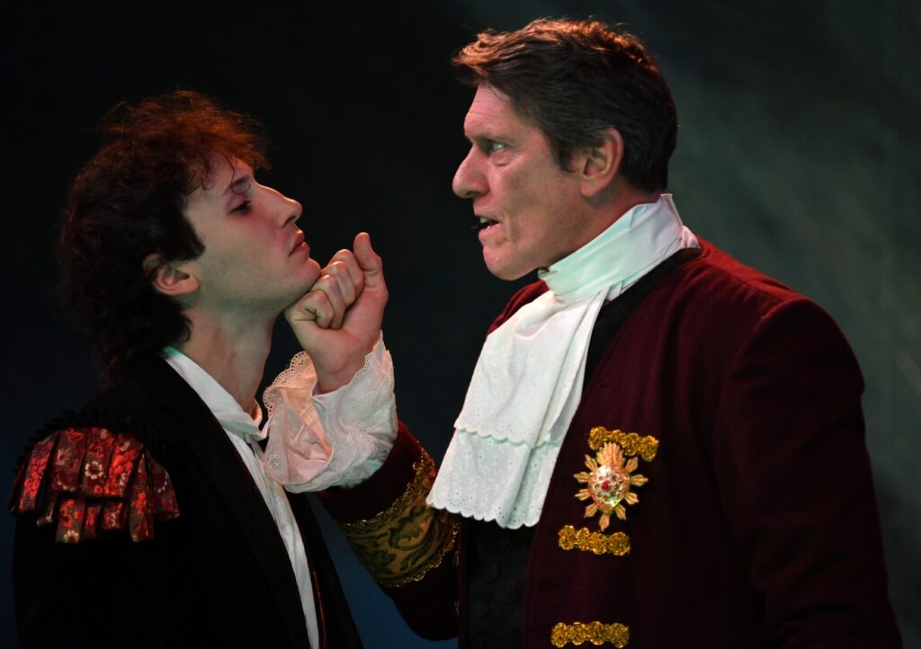 Autour de Philippe Girard, les autres comédiens sont tous excellents. Nemo Schiffman, vif et puissant jeune acteur, incarne un prince Frédéric II fondu d’amour, brisé par son père, saisi d’un profond sentiment de révolte, face à Tom Mercier, qui campe avec une élégance mystérieuse et une douceur féline l’officier Katte. Il se dégage de ces deux jeunes comédiens une relation au romantisme affirmé, à la grâce intemporelle, que la mise en scène de Frédérique Lazarini, avec la complicité de Didier Brun pour la lumière et de Régis de Martin Donos pour le décor, cisèle délicatement. Odile Cohen, la Reine, et Marion Lahmer, la princesse, parées de robes superbement conçues par Emmanuel Courau et Laurence Cucchiarini, interprètent avec talent celles qui sont laissées pour compte, méprisées et violentées par le pouvoir castrateur et démoniaque du Roi. Dans le rôle du ministre Seckendorff, retors, d’une fidélité totale à son roi, Stéphane Valensi est sulfureux à souhait.