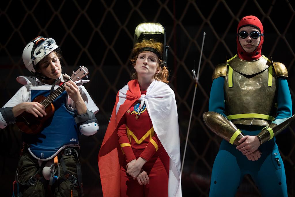 Mais d’où viennent-elles, ces gamines aux genoux cagneux et sanguinolents, qui surgissent devant nous avec des fourches ou autres instruments, les yeux brillants de colère et la lèvre écumante ? Du catéchisme ou d’un camp religieux, car leur tente, ou tipi, est encore dressé, surmonté de drapeaux et rempli de casseroles et de perceuses. Après « Vivipares, brève histoire de l’humanité » présenté en 2016, Céline Champinot et son équipe de comédiennes de choc, à la manière d’un commando, prennent le plateau en l’investissant d’un feu d’artifice de paroles, d’objets et de bruits divers. Du Novarina mâtiné d’agit-prop et des Monty Python. Arnachées comme des guerrières, outillées comme des héroïnes de science-fiction, nos gamines révoltées s’en prennent naturellement à Dieu le Père, coupable d’avoir fait de nous-mêmes, les humains, des colons assoiffés de terre et d’argent.