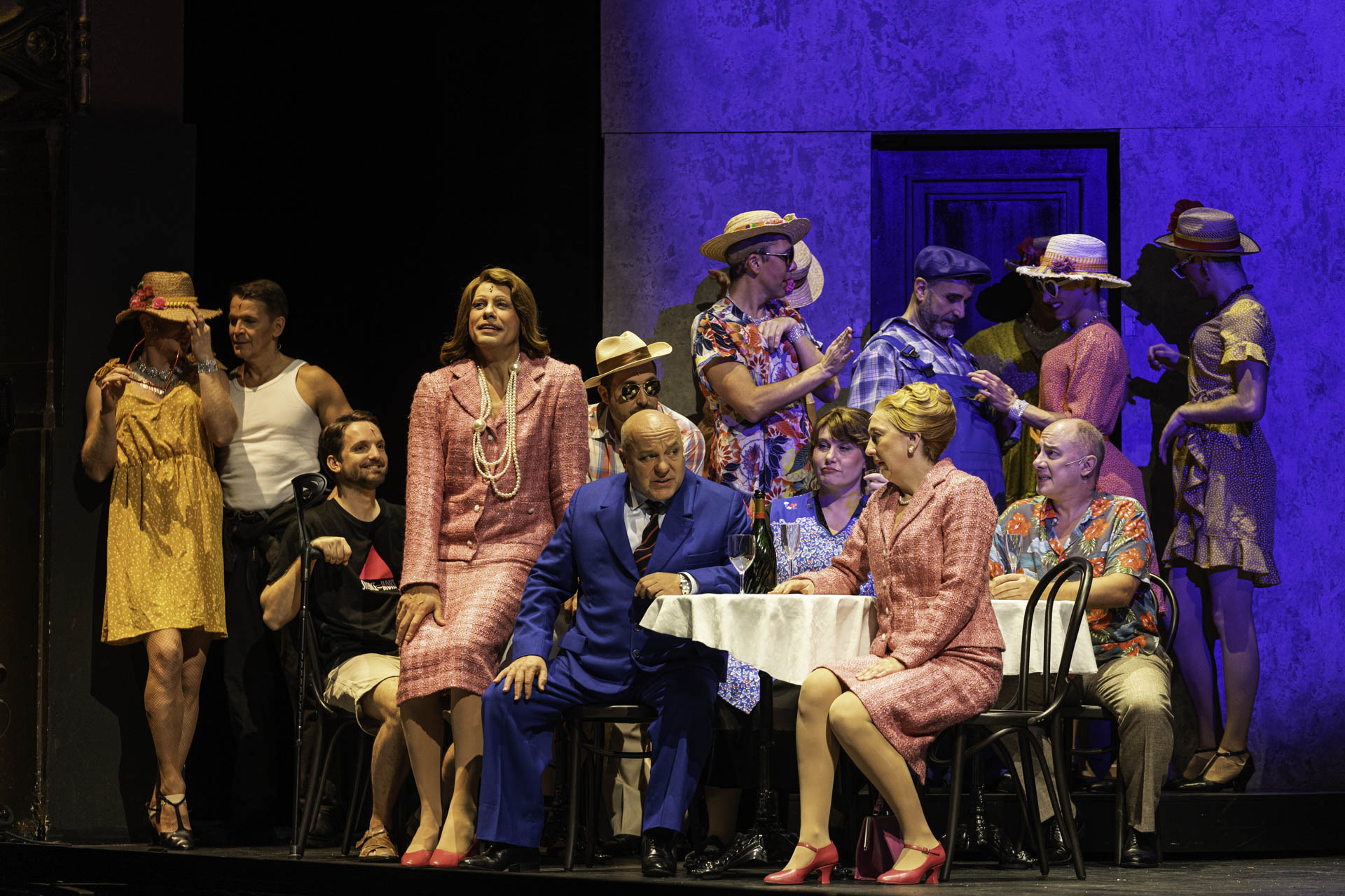 Il faut saluer la profusion de décors pivotants, d’un côté le cabaret façon Lido enluminé de manière étincelante grâce à Bertrand Killy, de l’autre l’appartement de Zaza, avec au milieu la place ensoleillée de St Tropez, le café avec la plage au fond. Le tout est d’une ingéniosité prodigieuse et les moyens ici sont utilisés avec une éblouissante maestria technique. Mais la comédie prend ici tout son sens, et on rit aux éclats, avec la mise en scène, théâtre dans le théâtre, du mariage de Jean-Michel (Harold Simon), le fils d’Albin-Zaza et de Georges, qui se doivent de dissimuler leur homoparentalité et l’univers du cabaret trans aux parents de la jeune fiancée, dont le papa, Edouard Dindon, est un député de la droite extrême et la maman une grenouille de bénitier. Les manifestations contre le mariage pour tous, le choc de l’arrivée d’une famille traditionnelle au sein d’une famille libertaire, font ici décoller le spectacle dans un joyeux délire et la confrontation de ces deux extrêmes n’a hélas pas fini de faire des victimes. Dans le rôle de Georges, présent quasiment continuellement sur scène, le comédien et chanteur Damien Bigourdan est parfait, d’une discrétion et d’une finesse remarquable. Avec Laurent Lafitte, ils forment tous deux un couple dramatique et vocal épatant de sincérité et de justesse, sans jamais en faire trop. Emeline Bayart est renversante dans le rôle Marie Dindon. On rit, on pleure, et l’orchestre dirigé royalement par le chef Christophe Grapperon, déploie ses sonorités Broadway avec les trompettes, trombones et saxophones multiples, alors que le piano et l’accordéon mélancoliques rendent hommage à Jacques Brel et à Barbara pour la chanson française. Entre Paris, St Tropez et Broadway, voilà une folie toute à fait savoureuse.
