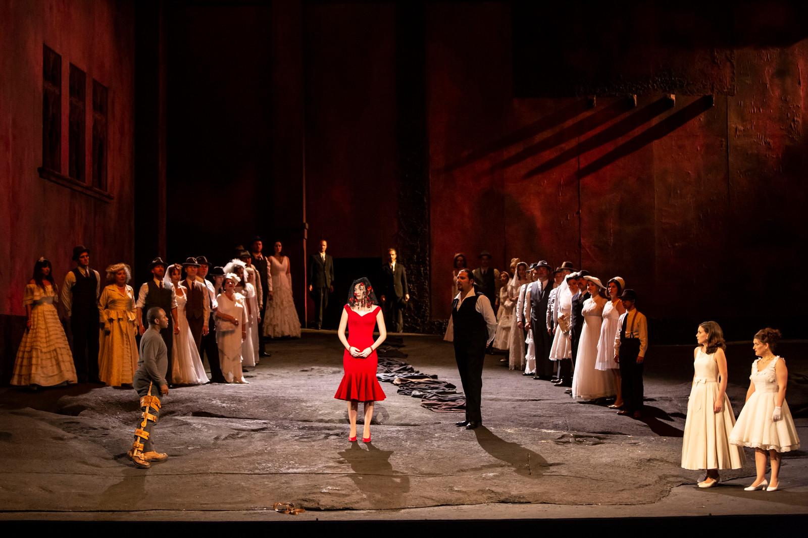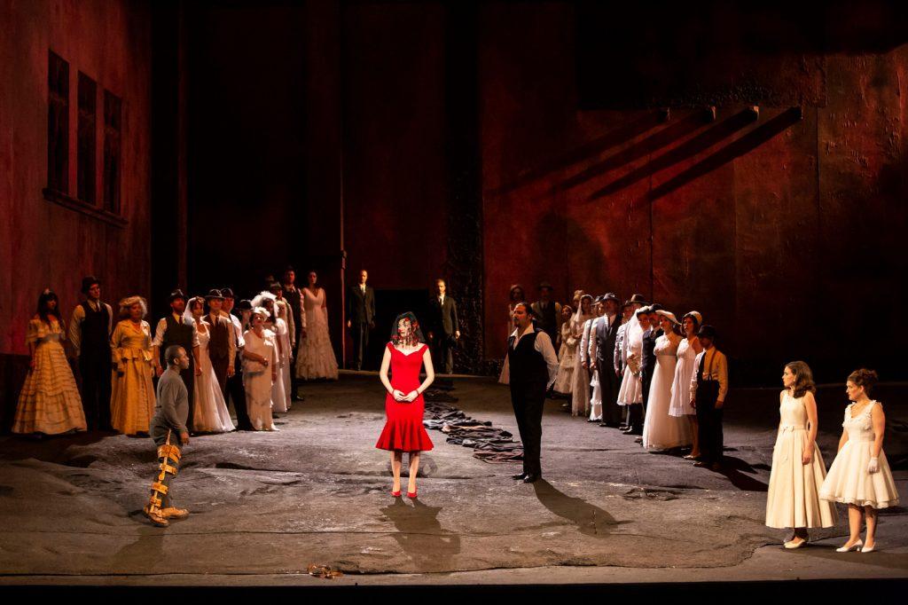 Avec ses costumes années 60 qui donnent une coloration nostalgique, teintée de cinéma italien, son décor en terre rouge aux façades baroques de palais délabrés signé Eric Ruf, cette Cenerentola s’ouvre sur une place publique napolitaine où Dom Magnifico, le fourbe maître de maison, campé par un Alessandro Corbelli éblouissant de roublardise et de vantardise, règne en tyran. Ses deux filles, Clorinda la prétentieuse et Tisbe la jalouse, se prélassent en mettant leur demi-soeur Angelina à la torture domestique. Chiara Skerath et Isabelle Druet, en robe blanche de gamines gâtées, sont impayables de perversité et de méchanceté. Quand à la souillon Angelina (Cendrillon), on la retrouve par la grâce de Marianne Crebassa, grande fille toute simple et ligne de chant d’une pureté et d’une élégance sidérale, pour exprimer avec une grande sensibilité la douleur et la solitude de l’exclue, rejetée de tous.