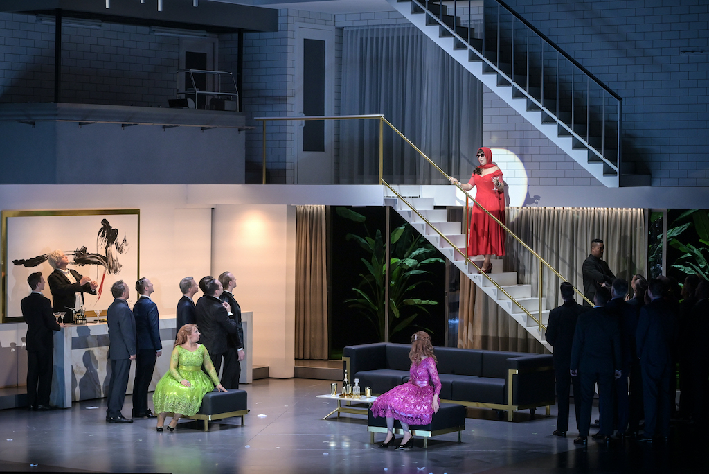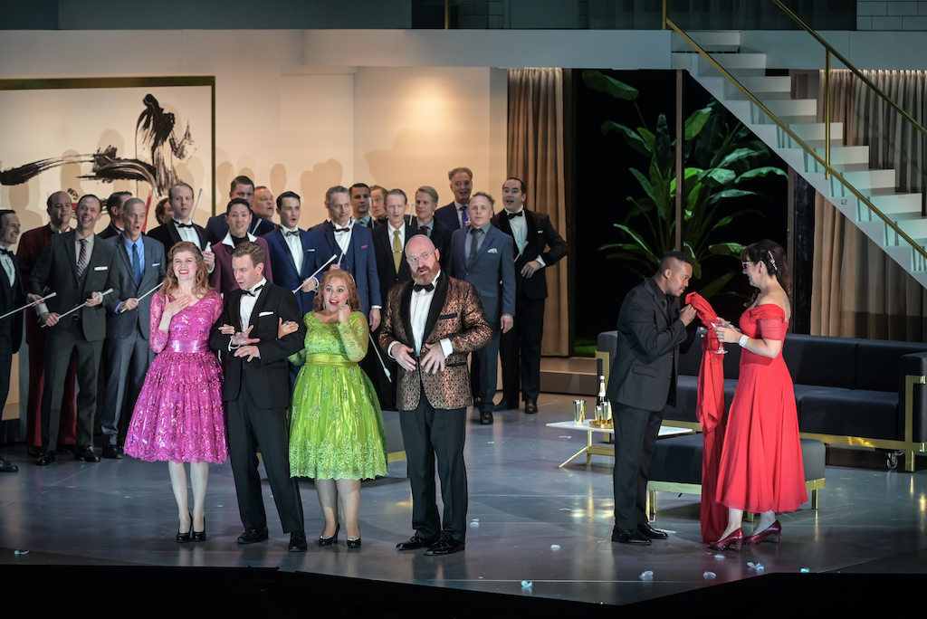 La mezzo Marina Viotti, au timbre velouté et suave, déploie sa présence chaleureuse et ses virtuoses vocalises avec une facilité, une sérénité et un charme déconcertants pour incarner Cendrillon. Devenue une vamp en fourreau rouge par la grâce du magicien Alidoro, elle captive les regards autant par sa voix que par ses yeux de braise. De loin, ses belles-soeurs, Clorinda-Alice Rossi et Tisbe-Justyna Olow, impayables en robes roses et vertes fluo, la toisent ou la rudoient, avec la complicité de leur père Don Magnifico qui croit en son propre nom dur comme fer. Peter Kálmán est fantastique dans ce personnage ridicule et imbus de lui-même, brutal et mégalomane, que le baryton-basse défend avec une puissance vocale et une habileté comique tout à fait remarquables. Il faut d’ailleurs, pour camper ces personnages à l’humeur si changeante, une technique de bel canto hors pair et un investissement émotionnel qui puisse traduire l’équilibre subtil entre un style pétillant et léger et des passages d’une touchante sincérité.