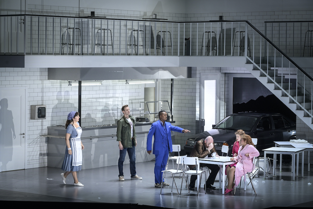 La première image est saisissante, qui dessine en ombre chinoise un personnage la tête coiffée d’un chapeau, se balançant en suspension dans le ciel, hésitant, planant, pour descendre progressivement se lover dans un coin d’une cafétéria au blanc clinique. Le rideau de soie crème se lève, l’homme volant enlève son chapeau et pose sa valise, inspecte le lieu, pour s’effacer ensuite avec la légèreté d’un ange vêtu de blanc, laissant le spectateur face au décor ordinaire d’une cafétéria bon marché. C’est là qu’officie Angelina, femme de ménage au grand cœur, héroïne rossinienne à la voix céleste qui jamais ne se laisse dicter ses actes. Armée de son sceau et de sa serpillière, moquée par ses deux pestes de sœurs qui se piquent d’être des reines de beauté, maltraitée par leur père qui règne en tyran domestique, Angelina chante pour oublier, non sans avoir levé les yeux -doux- vers un homme à la simplicité sympathique, venu boire un verre avec son patron. Ordinaire et féérie, dureté et tendresse, haine et amour naissant, la mise en scène de Damiano Michieletto, que l’on avait salué dans « Le Barbier de Séville » à l’Opéra de Paris, séduit d’emblée par sa finesse et son astucieuse intelligence des situations. C’est l’humanité des personnages, avant tout, qui leur permet d’exister et de rayonner.