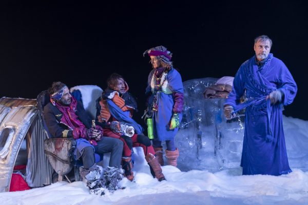 Dans la pièce, au milieu d’un épais manteau de mousse diaphane, neige céleste qui ressemble à un nuage de paradis (belle scénographie de Constance Arizzoli) Yvonne Barnette, jouée par l’explosive Joséphine de Meaux, tente d’organiser son campement en altitude. Cette bourgeoise provinciale, tenancière d’un salon de thé, a décidé de recomposer une autre réalité avec une bonne humeur et une énergie dévastatrice, organisant la cuisson des paquets d’amandes congelés, créant des vêtements avec des bouts de mousse des fauteuils d’avion, et dirigeant son râleur de mari avec une baguette et un bagout incompressible. Jean-Luc Vincent, qui joue Lionel le mari, emmitouflé de vêtements aux couleurs pétantes, ne peut stopper la douce folie de son épouse allumée par le grand froid et prend le parti de bouder. Sauf quand la faim qui le taraude le fait songer à réchauffer la cuisse athlétique du steward pour leur prochain repas, alors que sa femme aurait souhaité garder cette chair musculeuse pour leur prochain Noël !