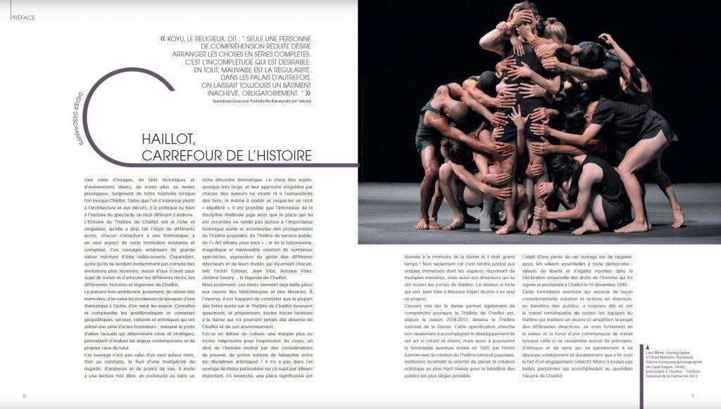 L’idée derrière cet ouvrage vient de Didier Deschamps, directeur de ce théâtre depuis 2011 et à l’origine de son appellation actuelle, Théâtre National de la Danse. Il s’agit de montrer les liens entre Chaillot et la danse, qui ont été riches mais largement oubliés. Au fil des 270 pages, se croisent les contributions de chercheurs, de critiques de danse, d’historiens, d’architectes et autres universitaires. Elles croisent les “Regards” de personnalités qu’on identifie par leur nom : Jack Lang, Abd Al Malik, Lilian Thuram, Angelin Preljocaj, Ohad Naharin, José Montalvo, Carolyn Carlson, Laure Adler… Mais cet ouvrage est grand comme un palais et l’équilibre entre textes et images est parfait.