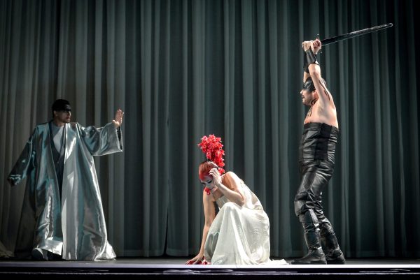 Le metteur en scène Cédric Klapisch respecte heureusement cet enseignement mozartien en actualisant les dialogues avec humour et en les retranscrivant en français d’aujourd’hui, afin d’en atténuer les clichés sexistes. Les personnages discutent donc dans le français des jeunes, métissé de mots d’argot et de références parodiques à l’écologie, et cela passe très bien. La scénographie colle aux contrastes entre le vert fluo de la forêt et le bleu des arbres au feuillage rouge sang, multipliant les connotations de la vie et de la mort dans un parcours magique qui passe par les vidéos en 3D du meilleur des mondes coincé dans un couloir de DATA informatisées. Mis en lumière élégamment par Alexis Kavyrchine, ce décor de Clémence Bezat, qui joue sur une géométrie en arcades, simple et efficace, et les incrustations animées d’animaux et de monstres de Stéphane Blanquet, sert de cadre aux somptueux costumes en tissu lamé conçus par Stéphane Rolland et Pierre Martinez. Robes sculpturales serties de traines, toges, habillage de plumes, masques de maquillages et coiffures hallucinantes modelées comme de l’orfèvrerie, l’esthétique fantasmagorique du conte est partout présente dans le spectacle qui donne à voir et à entendre l’histoire avec une parfaite lisibilité.