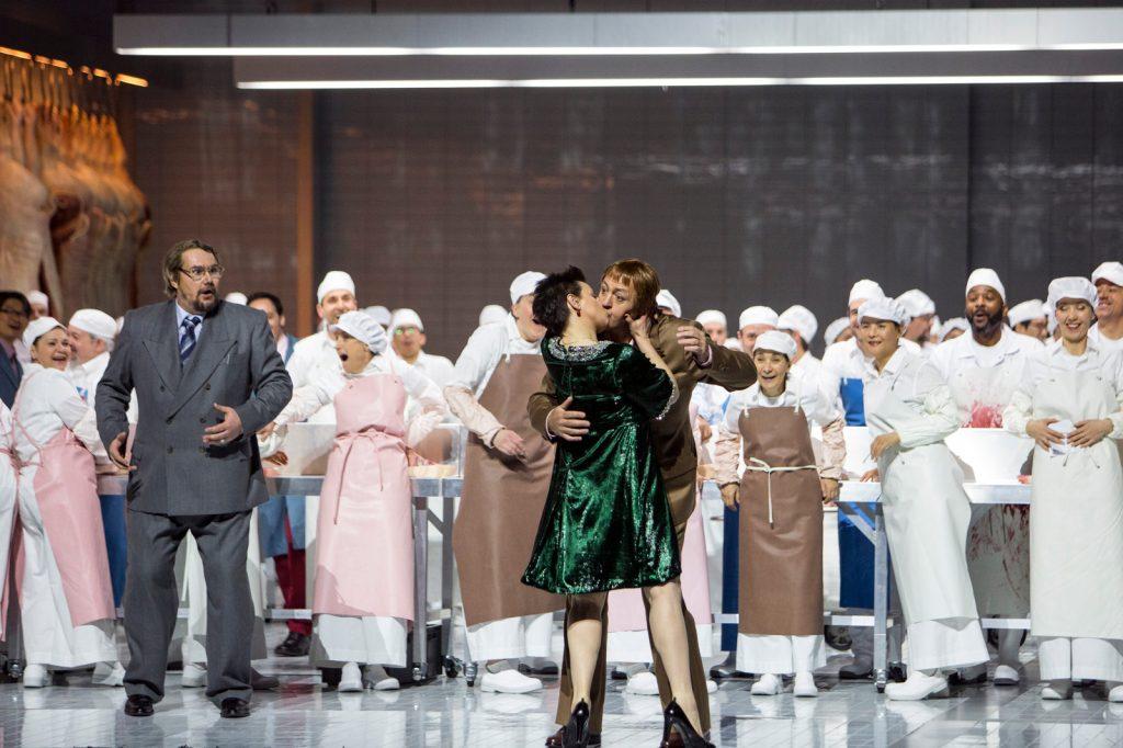 C’est dans un immense abattoir que s’ouvre le premier tableau, alors que les carcasses de bœufs et de porcs ouvrent leurs flancs sanguinolents dans l’attente d’être dépecées. C’est donc un “balance ton porc” général qui sous-tend le tableau et que domine la petite et forte Katerina, Aušrinė Stundytė, soprano lituanienne capable de tout ici, des médiums doux et veloutés aux cris rauques et stridents, sensuelle et violente, mystérieuse et cash, moderne et antique épouse du patron de l’usine, qui se consume d’ennui avant d’être broyée par ses crimes. Proie de tous les regards dans un monde d’hommes marchands et prédateurs, elle est surveillée par son tyrannique beau-père et négligée par son mari, un faible, qui a mieux à faire. Avec une puissance saisissante, le livret de Chostakovitch fait de cette Bovary russe la victime d’un système déjà concentrationnaire, dans lequel la femme n’a pas d’autre injonction que de cuisiner et d’obéir aux hommes. La force de la mise en scène est de nous montrer clairement comment la répression fait des anciennes victimes des bourreaux, comment le pouvoir change de main, de politique à sexuel.