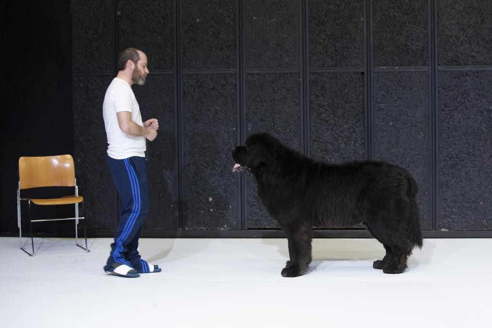 Dans L’Art du théâtre, Arthur Nauzyciel partage le plateau avec Elboy, un chien Terre-Neuve massif et placide, au pelage noir épais. Arthur Nauzyciel s’adresse uniquement à lui, le chien, qui de toute évidence ressemble à un brave ours, tandis que le comédien apparemment inoffensif ne manque pas de mordant. Le comédien est en tenue de sport, claquettes aux pieds. Il arpente un plateau blanc, comme Pascal Rambert y recourt souvent dans ses mises en scène. Une réflexion quelque peu bouffonne sur l’art du comédien se met alors en place, exprimant la puissance de feu qu’il représente mais égratignant aussi avec férocité les styles actuels, genres officiels relayés par des metteurs en scène qui ici en prennent pour leur grade.