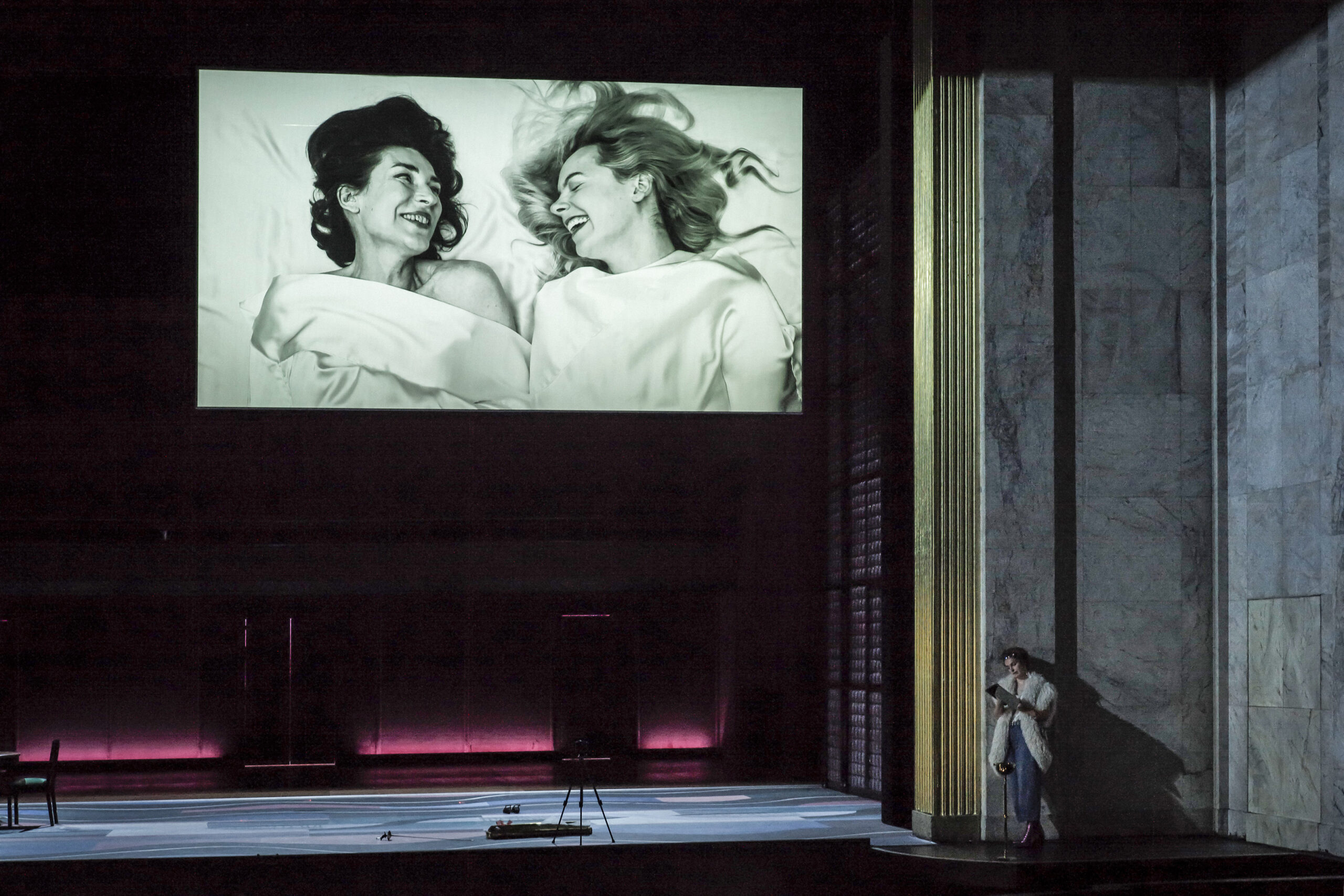 En 1911, Richard Strauss compose avec son ami et poète Hugo Von Hofmannsthal un chef-d’œuvre musical et poétique inspiré du théâtre français, qui prend place dans une Vienne monarchique du XVIIIe siècle. Plus classique et moins novatrice qu’Elektra, l’oeuvre se teinte de réminiscences très mozartiennes, éloignées de la musique de son contemporain Richard Wagner, en évoquant le temps qui passe avec une mélancolie bouleversante, sous la forme d’une valse viennoise qui revient comme un motif obsédant. Une comédie qui n’a aucun lien avec les thèmes de la mythologie, une pochade cruelle et sentimentale qui célèbre l’amour dans un monde convenu par une hypocrisie machiste et marchande, dans un empire en perte de vitesse, dont les échos, en 1911, s’annoncent funestes. Voici donc une Maréchale dont le mari court le monde, va à la chasse, et qui s’amuse tendrement avec un chérubin, un adolescent de 17 ans aux joues encore très douces qui lui fait tendrement la cour. L’opéra s’ouvre sur une scène sentimentalement torride, où les amants, étourdis par les mots doux, se jurent dans l’intimité un amour éternel. Mais l’humour jaillit aussi du livret poétique d’Hofmannsthal, gorgé de termes français, pour faire de cette romance un doux moment entre Bichette et Quinquin. Parce que le rôle de l’adolescent Octavian est chanté par une femme, comme le Chérubin du Mariage de Figaro de Beaumarchais, le metteur en scène projette d’emblée une vidéo en noir et blanc des deux interprètes partageant des ébats amoureux dans un lit, Véronique Gens et Niamh O’Sullivan, félines et sororales. La relation de Marie-Thérèse et d’Octavian devient donc, si ce n’est en rêve, une relation homosexuelle. Warlikowski ne cessera de creuser ce sillon jusqu’à la scène finale où Sophie, la nouvelle fiancée d’Octavian, lui enlève sa perruque d’homme.