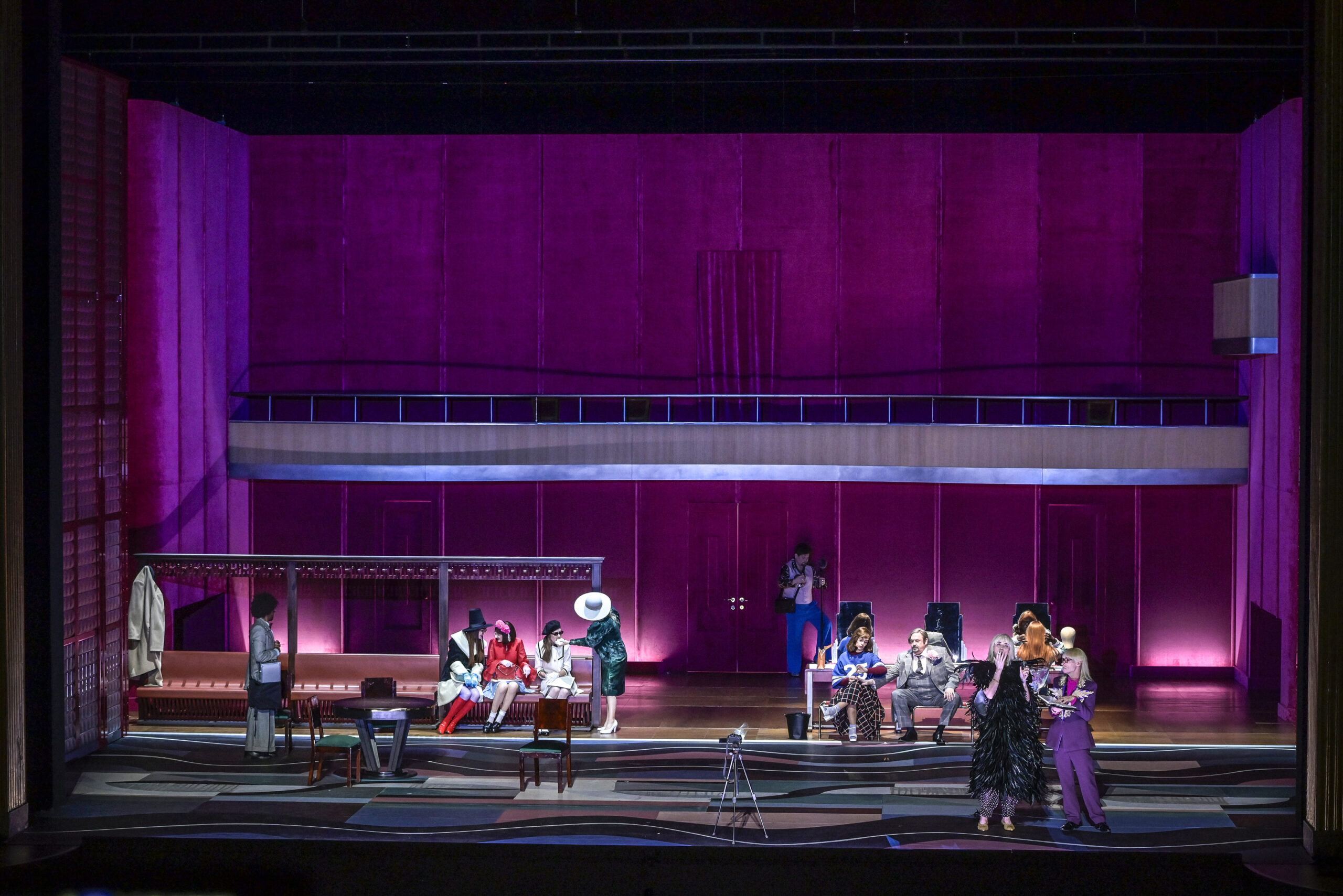 Dès lors, prise au jeu du dévoilement moderne, la mise en scène cherche à briser les codes classiques en multipliant les références à la modernité et au clinquant des années post-modernes. Le décor est celui de la petite salle de la Comédie des Champs Elysée, petit théâtre à l’italienne, le Studio, avec ses balcons de velours rouge, mais très vite masqué par un froid mur de verre incrusté pour des scènes plus intimes. Tantôt scène de théâtre, envahie par une faune de noctambules habillés en Gucci avec des couleurs voyantes, tantôt alcôve cinématographique, avec un Octavian genderfluid dont l’indétermination de genre est dénotée par une allure dansante, des vêtements de mode ambivalents, et qui court d’un monde à l’autre comme à la recherche de lui-même. Et c’est la profusion scénique, qui multiplie les références, portables et cigarettes que l’on grille à tout bout de champ, défilé de danseurs de break-dance, chanteurs et figurants tout droit sortis d’un défilé de mode londonien, mélange d’ocre et de violet, qui finit par brouiller les pistes de compréhension du spectateur qui perd souvent le fil de ces personnages.