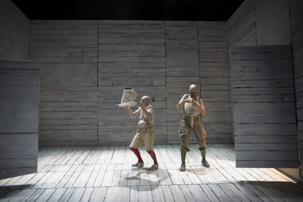 Quelle grande idée d’avoir confié à la frêle Julie Sicard le rôle du ridicule et vantard Sganarelle, risée de tout son entourage ! La tête coiffée d’un masque de vieillard, le crâne dégarni et un drôle d’habit campagnard qui laisse émerger des mollets rougeauds, voici la comédienne parée à tous les ridicules, la voix criarde et le ventre bedonnant, en quête d’une épouse. Méconnaissable, l’actrice tout feu tout flamme n’a plus ni genre ni sexe, engagée tout entière dans la quête éperdue de son personnage bestial et vantard qui cherche à se procurer une compagne pour ses vieux jours et sa descendance. Sganarelle, qui tient autant du barbon de L’Ecole des Femmes que de L’Avare, prend des conseils chez tous. Voici Géronimo son ami, qui surgit d’une porte qui s’ouvre, joué par Gaël Kamilindi, visage sculpté dans le bois d’une marionnette, qui ne peut lui faire entendre raison, comparant son âge avancé à celui de la jeune promise, puis le philosophe Pancrace, crâne d’oeuf oblongue et yeux charbonneux, vêtu d’une longue blouse noire ouverte dans le dos sur ses fesses nues, qui se gargarise de son savoir en latin et en grec sans jamais écouter son interlocuteur Sganarelle, qui se roule par terre comme un enfant.