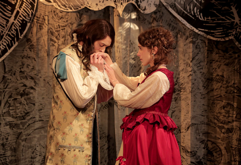 On utilise les bords de scène pour s’embrasser ou se haranguer, les acteurs virevoltent d’un rôle à l’autre, se changeant à vue en balançant leurs costumes de velours carmin ou de toile écrue, tandis que la musique ravissante de Lully rythme les entrées et les sorties et imprime aux scènes de déchirement une touche de majesté royale. Salomé Villiers, qui porte le projet, est la Montespan, encore jeune et fraîche dans son tendre amour pour son jeune époux, jusqu’à la naissance de leur second enfant. Fine et gracile, la comédienne se mue en paysanne ou en veuve éplorée avec une impressionnante palette dramatique, tandis que Simon Larvaron campe le héros avec une beauté altière et un verbe aiguisé. Arlequin modeste mais multi-cartes, l’humoriste Michaël Hirsch campe tous les autres personnages avec un talent impressionnant, échangeant une barbe contre des moustaches, une perruque ou un tablier pour peupler la scène de tous les protagonistes. La scène avec le jeune roi d’Espagne, à moitié débile, est un somment de drôlerie. Voilà en tous cas une création très réussie, divertissante et édifiante, qui peut réjouir tous les publics.