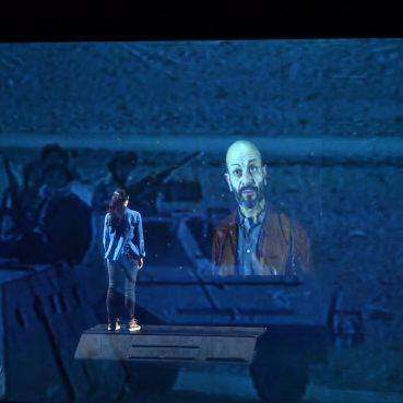Julien Bouffier et la scénographe Emmanuelle Debeusscher croisent en permanence la présence des comédiens sur le plateau avec des images qui défilent et les entourent, les mêlant à un autre tempo qui est celui des images d’archives ou de vidéos du Liban reconstruit. Il faut à cet égard saluer le remarquable travail vidéo de Laurent Rojol, car la caractéristique de ce spectacle intense réside en l’art de projeter un flot coloré, onirique et pourtant violent, terriblement réaliste parfois, où l’actrice se fond, emportée dans l’horreur malgré sa rébellion. Le film de la troupe en répétition sur une terrasse blanche propulse Antigone et les héros de la mythologie grecque. Mais ceux qui les incarnent sont aussi les personnes réelles de l’actualité et la furie de la fiction et de la réalité plonge le public dans cette lutte. Le quatrième mur, qui est au théâtre la ligne imaginaire séparant la salle de la scène, est en quelque sorte détruit par l’inventivité de la scénographie. La volonté d’Antigone et celle de la metteur en scène qui ne renonce pas à son projet s’imbriquent. Prolongeant cette troublante superposition, la musique et la voix d’Alex Jacob, qui est sur le bas-côté de la scène, délivrent des sons et des chants impressionnants. La belle interprétation de The Sounds of silence de Simon and Garfunkel arrive en une lave bouillonnante puis s’immisce dans les airs et se répand et enveloppe le passé et le présent.