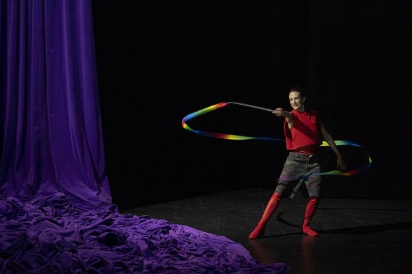 Ce sont les jambes de l’actrice qui jaillissent d’abord, en ciseaux, gainées d’un collant écarlate, du magma de tissu violet qui bruisse et frémit par vagues pour finalement envahir tout l’espace scénique. Le son est désynchronisé par rapport au corps, qui subira une lente transformation au fil de la soirée. L’habillage scénique, la lumière, le travail sur le son, concourent à former autour de la comédienne un écrin suave comme de la guimauve, visqueuse et sucrée, qui semble l’emprisonner. Camille Cottin, tout d’abord invisible, se confie au gynécologue qui lui répond laconiquement par la voix de Jonathan Capdevielle en régie. Le corps fin, androgyne, fuselé dans un justaucorps rouge et un long short de treillis militaire, apparaît alors, lutin sauvage prêt à régler ses comptes avec l’Allemagne, ses fantômes nazis, son calme dénué d’humour, mais aussi avec un arrière grand-père qui fut chef de gare en Silésie -une station avant Auschwitz- et une mère trop étrangère à la petite fille effrontée qui grandit comme une mauvaise plante.