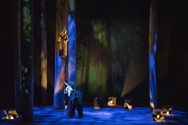 En fond de scène, une forêt sombre et dénudée, le monde réel, alors que sur la scène le théâtre invente le sien, lumineux et chaotique, peut-être le plus juste des mondes. Et on sait gré au metteur en scène de faire un théâtre enfantin dont les ficelles paraissent grosses, dont les jeux de scènes paraissent forcés, assumant ainsi l’artifice d’un jeu qui ressemble aussi à la vie. La salle vibre à l’unisson de ces personnages totalement décalés, de cette belle reine Titania, descendue des airs dans une robe somptueuse, qui fricote avec le museau d’un âne. Valérie Dashwood (Titania) et Philippe Demarle (Obéron) sont deux comédiens aguerris dont la technique et le brio ne sont plus à démontrer. Et pour multiplier encore la confusion des sens, Puck est incarné par trois jeunes comédiens agiles comme des enfants. Apparitions et disparitions, rêves et prémonitions, les personnages semblent tous courir après leurs rêves, se débattant dans des désirs sans cesse mouvants, comme les arbres qui voyagent en même temps que se déploie l’histoire. Un spectacle qu’on aurait souhaité justement plus énigmatique, plus nébuleux, comme l’est le tissu énigmatique de nos rêves, ce tremblement dérangeant qui fait de la monstruosité un désir, qui fait de la beauté un cauchemar. Bref, que cet inconscient le soit davantage. Mais la beauté des images et de la scénographie donne à aimer la magie du théâtre, portée ici par la belle énergie, la sincérité des comédiens qu’il faut admirer.
