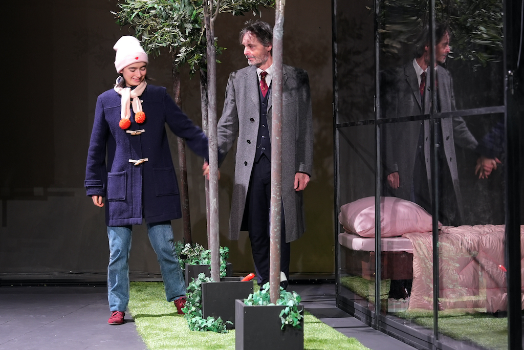 Entre la maison d’Arnolphe, dont la porte blindée est sévèrement surveillée par les domestiques Alain et Georgette, joués par Alain Cerrer et Emmanuelle Galabru, vêtus de combinaisons dédiés à la surveillance, et la chambre vitrée et sonorisée d’Agnès, un chemin bordé d’arbres permet la promenade et la visite, parfois dangereuse, du jeune Horace. Kitch, le canapé lit rose d’Arnolphe lui permet de  se morfondre en écoutant Agnès révéler les caresses de son amoureux. Il y a dans toute cette comédie en alexandrins, sublime de vérité, une tragédie amoureuse, celle de la jalousie et de la possession fatale qui détruit celui qui souffre. L’ami Chrysalde, campé par Guillaume Veyre, qui comme Philinte pour Alceste, ne parvient pas à raisonner Arnolphe, à calmer les ardeurs de sa folie jalouse, ne pourra plus rien pour sauver son ami. Au fil de cette représentation dont le réel objectif se morcèle en deux visions totalement antagonistes, la jeunesse effervescente de jeunes amoureux, et la maturité d’un homme accroché désespérément à ses fantasmes de possession féminine, le malaise des spectateurs que nous sommes fait place à l’émotion d’une difficile renaissance : celle d’une jeune fille qui apprend à être libre. Et c’est très beau.