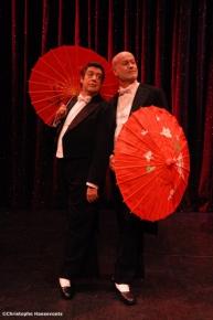 Au programme, chansons, tours de magie, saynètes théâtrales, danse… et querelles d’anciens amants, le tout occasionnant d’irrépressibles envies de rire. Pour les chansons, nos deux auteurs sont aller chercher des perles rares du répertoire de l’entre deux-guerres (Mistinguett, Dranem, Albert Willemetz…), d’autres à peine plus récentes (Bernard Dimay, Franck Gérald) comme ils ont demandé à François Morel, Jean-Michel Ribes, Pascal Mary… de leur écrire des textes. Aussi, même quand ils entonnent des airs connus, par exemple « Etoile des neiges » ou « Le petit chien dans la vitrine », c’est sur des paroles totalement inattendues qu’ils nous cueillent. Attention cependant celles-ci, comme le texte de ce spectacle à la langue très fleurie, voire trash, ne sont pas à mettre entre toutes les oreilles ! Car ici, pas de barrières… sinon celles du bon goût puisque Denis D’Arcangelo et Jean-Luc Revol aiment à cultiver le mauvais… sans jamais se départir de leur malicieux humour au deuxième, troisième ou dixième degré ni de leur élégance subversive. Quant à leurs tours de magie et autres imitations (dont celle de Pierre et Marie Curie découvrant le radium !), numéros de ventriloquie, de télépathie, de morpion funambule et j’en passe, certains sont carrément des moments d’anthologie.