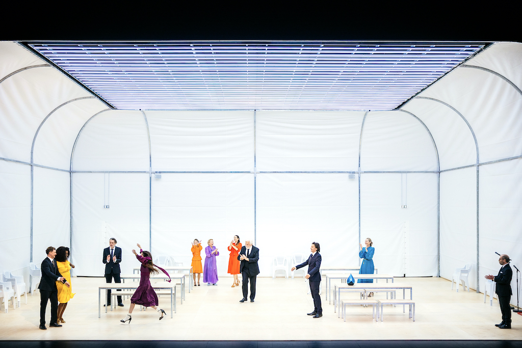 Tout commence par la mort de la grand-mère qui lisait Heidegger en allemand mais qui cachait des Juifs dans un minuscule appartement rue Jacob durant l’Occupation. Cent cinq ans d’une vie que son fils, Jacques Veber, expédie entre tendresse et détachement, alors que sa petite fille se marie. L’urne en forme de grosse goutte d’eau bleu azur trône au milieu d’une des longues tables qui occupent cette immense salle de restauration cernée d’une bâche en toile plastifiée, dont les ouvertures à fermeture éclair claquent furieusement au vent des passages successifs. La cérémonie de la crémation anticipe le mariage, mort, naissance et mariage se succèdent à la vitesse accélérée d’un métronome compulsif. D’ailleurs, sous cette lumière blanche éclatante, chacun des personnages surgit à la vitesse de l’éclair, pour disparaître aussitôt en courant. Seul Jacques (Veber) le patriarche député-maire-psychiatre et linguiste et Marilú (Marini) son épouse semblent posés. Tout comme sa fille Anne (Brochet), entièrement habitée par l’écriture de son roman et délaissant son cabinet de radiologie, alors que sa relation à son mari, Arthur (Nauziciel) est excécrable. Il faut dire que dans le théâtre ardent de Pascal Rambert, les personnages sont les acteurs eux-mêmes, dans ce mille-feuilles étourdissant du théâtre dans le théâtre.