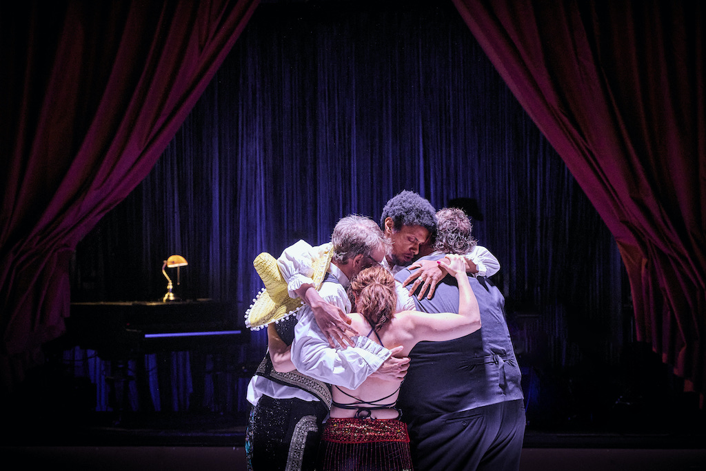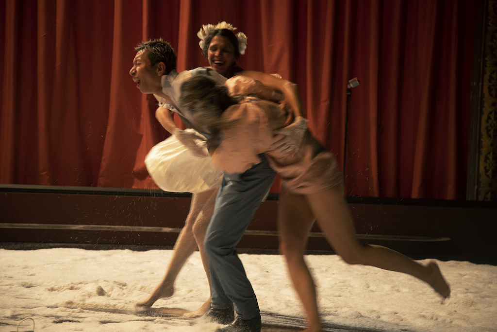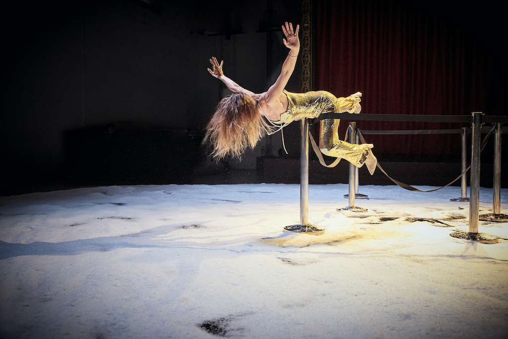 Un tapis de poudre blanche comme la neige a envahi le grand plateau, qui s’ouvre en bi-frontal, longeant les rangées de spectateurs de chaque côté d’un angle droit, alors qu’en fond de scène se dresse un rideau de théâtre rouge. Mystérieux rideau qui s’ouvrira sur une boite de nuit, une boite de jeux, un lupanar décadent aux pratiques mystérieuses ou un appartement qui recèle des poudres magiques pour s’enivrer. C’est un véritable terrain de jeu qu’offre le metteur en scène Frédéric Bélier-Garcia à ses jeunes acteurs inspirés qui ne vont pas tarder à envahir la scène. L’amour, les miracles de l’au-delà, le lien mystique, le désir, la joie du Nirvana, l’amitié passionnelle et les liens de tout ordre, au Christ, à une femme, à un homme, à son frère, sont les axes qui conduisent des personnages un peu à la dérive à s’accrocher désespérément aux autres. Comme la superbe danseuse en costume doré de sirène, qui peine à se stabiliser sur ses talons, comme éjectée d’une rave party, gorgée à la vodka, qui s’arqueboute avec une grâce stupéfiante, une élasticité virtuose, aux cordes d’un praticable de sécurité. La musique rugit sur une création de Bernard Vallery. La lumière dorée de Dominique Bruguière magnifie les personnages qui semblent en déséquilibre constant sur le plateau. Surgit un vieil homme, cancéreux, qui se gave des visions si tumultueuses avant de disparaître dans son hôpital.