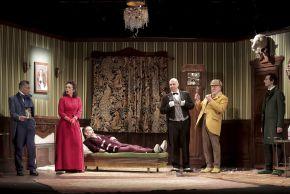 Théâtre dans le théâtre, les comédiens jouent des comédiens amateurs. Ceux-ci ont soi-disant retrouvé une pièce de Conan Doyle, le célèbre auteur de romans policiers qu’ils adulent. Mais pour jouer les passionnés pas très doués, il faut d’immenses qualités et c’est le cas. L’enchaînement de gags et situations loufoques est mené tambour battant, suscitant rire sur rire. Comme aiment à le faire parfois les compagnies qui jouent pour leur plaisir devant des salles remplies d’amis, les comédiens commencent par se présenter et ils adressent un petit mot complice au public avant le démarrage de leur pièce. Dès ce préambule, on sent un manque de rigueur et on peut s’attendre à ce que cette équipe ait les travers du patronage… mais c’est bien pire encore ! On se trouve dans un manoir anglais en un salon cosy avec cadres dorés aux murs ainsi que trophées de chasse au-dessus des portes. Une soirée de fiançailles s’annonce, kitsch à souhait. Alors que l’ambiance est à la fête, patatras, le fiancé est découvert mort sur le sofa. La panique démarre. Immédiatement, on appelle un inspecteur qui, bien sûr, fume la pipe et a tout du détective doté du flegme britannique. Évidemment, que s’empresse-t-il de faire ? Il suspecte tous les invités présents à tour de rôle. L’atmosphère vire à la tension, qui, mal maîtrisée par les acteurs amateurs, se transforme en une époustouflante dinguerie. Et ça ne s’arrêtera plus !