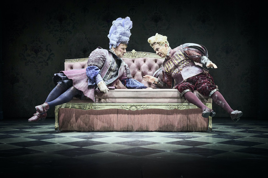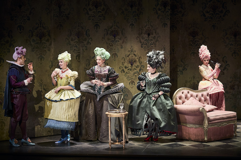 Dès lors, à l’arrivée rocambolesque de Chrysale, incarné par un éblouissant Laurent Stocker, et de son frère Ariste, merveilleux Eric Génovèse, tous deux confits comme des oies dans une armoire portative, emperruqués de choucroutes en forme de meringues géantes, le corps boudiné dans des costumes gonflés comme des montgolfières, la farce et le délire sont à leur comble et on comprend que les messieurs arrivent en même temps que le décor se pare de tapisseries somptueusement fleuries, alors que des corbeille de fruits et de fleurs jonchent le sol ou viennent glisser, dans un rêve tout rose, des canapés couleur chair aux formes sensuelles. La scénographie fantastique signée Vanessa Sannino, qui a créé aussi les costumes d’une originalité phénoménale, transporte le spectacle dans un songe italien, à Venise, où le langage, justement, tient lieu de séduction, de désir et de jouissance. Alors que les femmes, dont la savante Philaminte, qu’interprète une Elsa Lepoivre méconnaissable, dragon autoritaire et intraitable, et Belise, vieille fille nymphomane incarnée par la formidable Aymeline Alix, déploient leur territoire empli de livres et de fleurs, mais débarrassé des hommes, sur des rythmes infernaux des Rolling Stones ou de l’électro qui pulsent comme des machines de guerre. Quant aux jeunes damoiseaux, le Clitandre précieux de Gaël Kamilindi, où le Trissotin bellâtre et fat de Stéphane Varupenne, ils sortent des canapés, s’extraient des malles, comme s’ils venaient d’un autre monde.