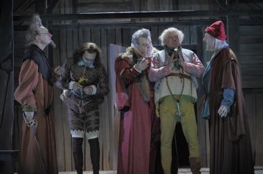 Ce désordre apparent est essentiel aux Joyeuses Commères de Windsor : il donne chair à cette ambiance de filouterie mutuelle et de franche camaraderie qui est au coeur de la pièce. Si Falstaff est le personnage central, la galerie de seconds rôles qui gravite autour de lui font de la pièce une mordante comédie de moeurs, qui brocarde à la fois maris et femmes, serviteurs et maîtres, médecins et pasteurs… Excellente Madame Pétule, Catherine Hiegel joue la vieille servante roublarde avec une joie qui se communique rapidement au public. Ses scènes avec Bruno Raffaelli, qui campe un Falstaff truculent, font partie des meilleurs moments de la pièce. Sans oublier Serge Bagdassarian, dont l’interprétation hystérique du mari qui se croit cocu est un véritable tour de force.