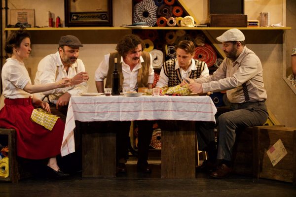 Sous une mauvaise lumière, dans un sous-sol dont les fenêtres minuscules sont voilées durant le cessez-le-feu, Raymond, le père, patron râleur mais magnanime, au fort accent méridional à la Pagnol, incarné à la perfection par Guillaume Bouchède, mène sa troupe de travailleurs pour sauver coûte que coûte son entreprise. A ses côtés, son épouse Yvette, campée par Stéphanie Caillol, travailleuse et sage, mais dont la force de caractère se révèlera avec la suite de l’intrigue. Autour des rouleaux de tissu, à découper et à rouler, se trouve aussi leur fille Paulette, que campe Axelle Dodier, une beauté piquante et peu farouche, un jeune homme nommé Joseph, incarné par Julien Crampon, dont on apprendra vite qu’il est juif par sa mère. Au moment où le jeune candide fait cette malheureuse révélation, le plus âgé et le plus silencieux des employés, Louis, joué par Anthony Michineau, change de mine. C’est que son ami de fraîche date, Marcel, est un milicien zélé qui écume le quartier en quête de Juifs sur lesquels il tire fièrement comme sur des lapins. Nicolas Martinez campe avec talent ce profiteur sans foi ni lois qui finira par préempter la juteuse entreprise.
