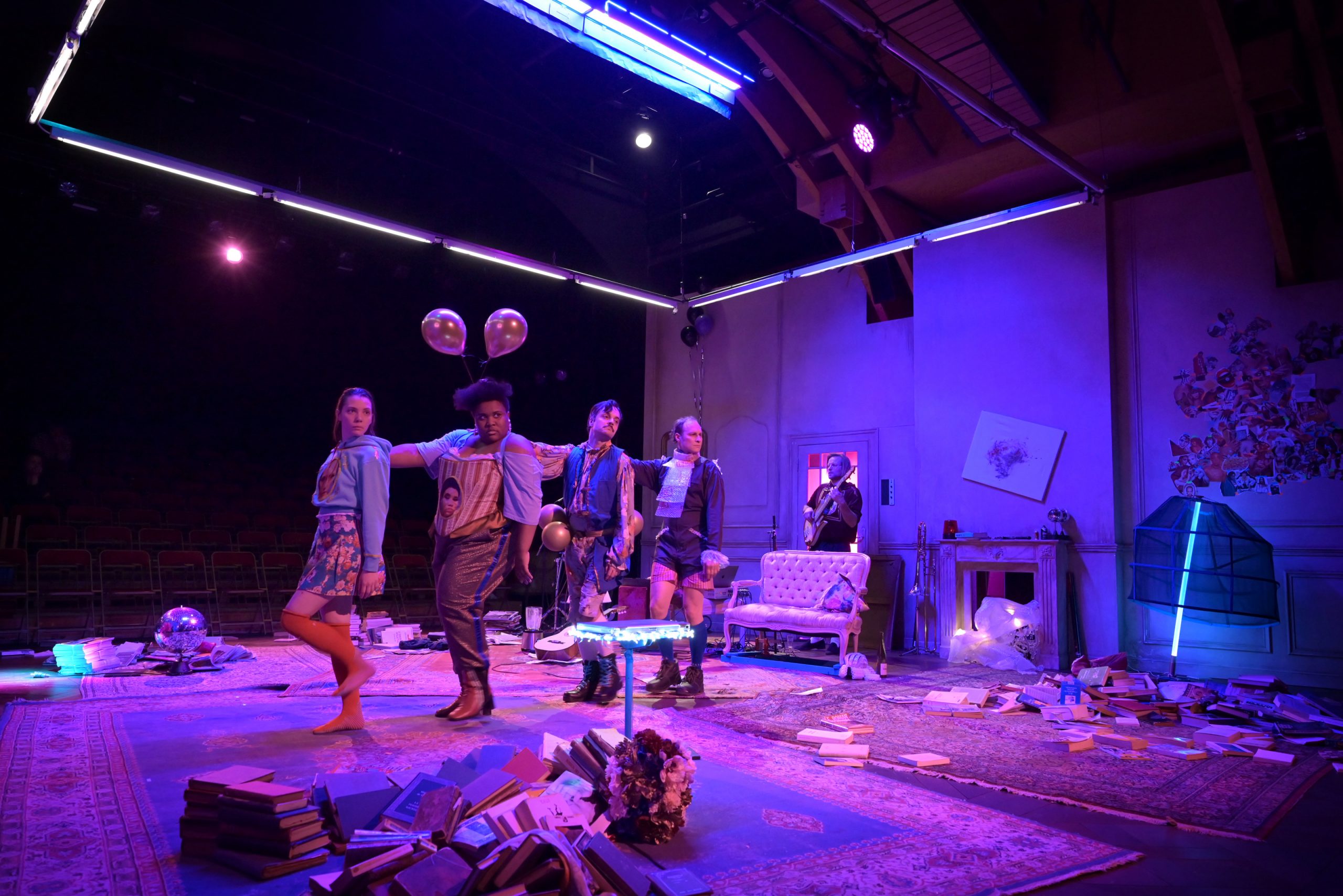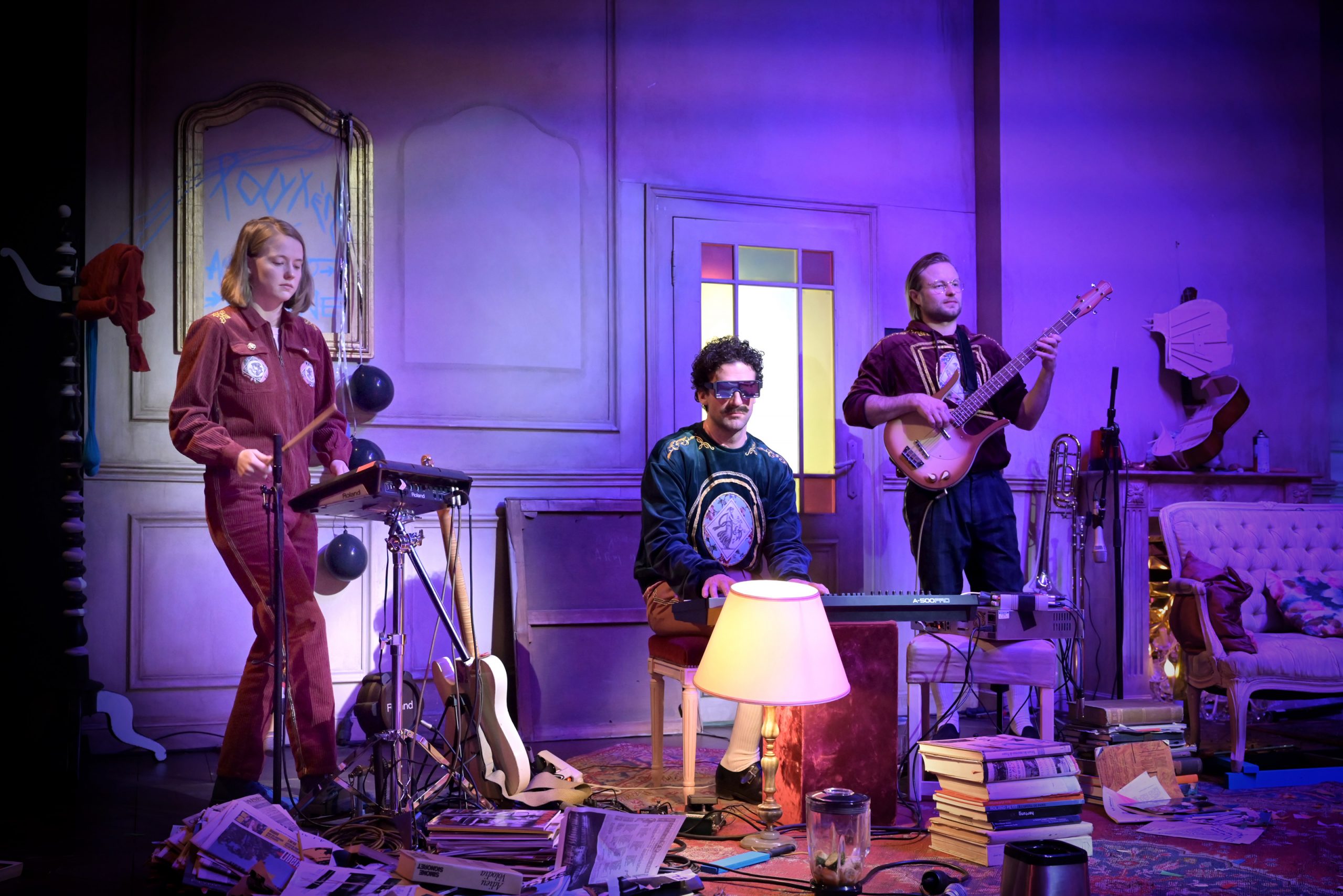 Les deux cousines se piquent d’art contemporain en plongeant leur visages dans de la peinture pour en faire des oeuvres, professent une liberté de vie que ne vont pas entraver ni les parents, ni les hommes, dont elles refusent de facto le mariage. La Carte du tendre sert de fond à un panier de basket suspendu au mur pour les galants qui osent se confronter à leurs exigences. Séphora Pondi, nouvelle pensionnaire, campe une Magdelon imposante et entreprenante, moulée dans une tenue disco qui scintille, tandis que sa cousine Cathos qu’interprète Claire de La Rüe du Can semble plus discrète, fragile et influençable dans sa jupe à fleurs et à panier. Dans cet univers où le juge suprême est un « conseiller des grâces » (le miroir) et dont l’armoire regorge de travestissements, débarque un drôle de messager, un Marquis du nom de Mascarille envoyé par deux jeunes prétendants nobles éconduits qui souhaitent se venger. Jérémy Lopez brille dans ce personnage doublement falsifié. En effet, les deux metteurs en scène, Stéphane Varupenne et Sébastien Pouderoux, qui jouent du trombone, de la guitare et des claviers sur le plateau tout en campant La Grange et Du Croisy, ont fait de Mascarille un ouvrier fantaisiste et hâbleur qui rénove l’appartement des belles et que les deux prétendants ont déguisé en marquis.