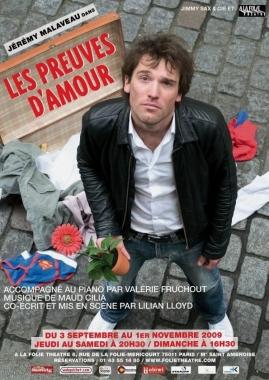« Aimez-vous les uns, les autres qu’ils disent ? Ben tiens ! Quelle jolie connerie l’amour ! D’ailleurs c’est quoi, hein ? On s’empare souvent du mot mais pas du sens. C’est délicat comme sujet ». Un sujet déjà bien présenté dans les salles de théâtre mais en effet toujours aussi délicat, sur lequel Jérémy Malaveau a décidé de travailler en créant ce personnage sympathique, auquel chacun pourra s’apparenter. Un choix dont il évoque lui-même les causes : « Le 29 Juin 2007, ce jour là, j’ai eu 30 ans. Je me suis dis, et si j’écrivais une histoire. Bonne idée ! Mais quoi ? Et oui, quand on a souvent dit les mots des autres, quand on a souvent joué les histoires des autres, on n’a pas pensé un jour à être à la place de ces « autres » : les auteurs. Et puis, ça démange, c’est trop tentant. Alors, voilà, j’ai commencé à écrire : LES PREUVES D’AMOUR. L’idée est venue, au départ, lorsque j’ai vu le film de Maurice Dugowson : Lily, aime-moi ! avec Patrick Dewaer, que j’admire comme beaucoup de comédiens de ma génération. L’histoire de cet ouvrier que sa femme a quitté et qui, grâce à deux losers, va réussir à la récupérer ». Jimmy parviendra-t-il, lui, à récupérer sa douce ? Le seul moyen de le savoir est encore d’aller le voir sur scène…