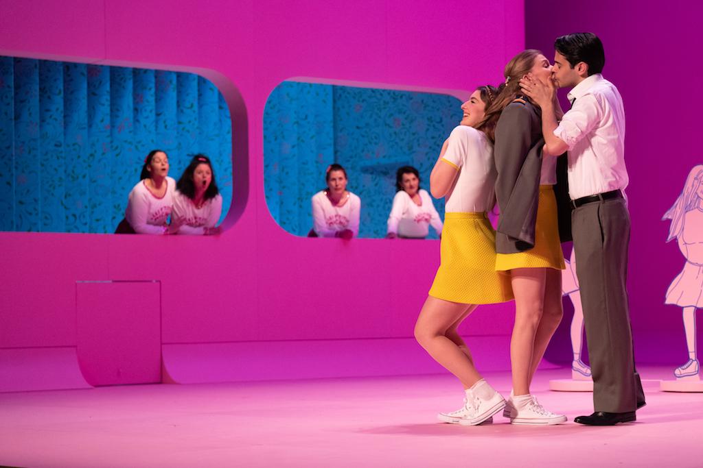 L’argument est forcément drôle, les quiproquos innombrables et le livret, alternant dialogues parlés et chantés à travers une succession de scènes cocasses et décalées, est une formidable machine à jouer. André Messager se saisit de tout cela et y brode une partition légère, lumineuse et d’une élégance alerte, parfaitement faite pour un petit orchestre. Celui des Brigands, qui a dépêché dans la fosse 12 jeunes musiciens en alternance, sous la direction précise et juste de Pierre Dumoussaud, parvient une nouvelle fois à la réussite totale. Mis en scène par Rémy Barché dans une scénographie tout en rose, dont les nombreuses images animées ( Marianne Tricot) dessinent un film des années vingt, tendre et subtil, le spectacle s’écoute et se regarde avec un immense plaisir qui allie intelligemment l’invention visuelle et la qualité vocale.