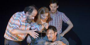 Au Poche Montparnasse, Marc Paquien monte la pièce de Michel Vinaver avec du doigté et de la rigueur. Quatre comédiens convaincants nous plongent en apnée dans l’étrange manipulation de deux voisins ordinairement tordus. Je t’aime moi non plus Chez les Blason, on est riche, précautionneux mais généreux. C’est pourquoi le père Blason, incarné par un Patrick Catalifo très en forme, ouvre sa table avec caviar et champagne à son voisin Laheu (Lionel Abelanski, épatant) tandis que son fils Ulysse (Loïc Morbihan) se morfond amoureusement pour les beaux yeux de sa fiancée Alice (Alice Berger) qui lui rend bien la pareille avec des œillades mouillées de tendresse. Dans la mise en scène de Marc Paquien, tout ce petit monde s’ébat sur quelques mètres carrés, entre deux maisons formées par des cubes blancs et un minimum d’accessoires. La lumière découpe par des noirs les scènes au rythme des pulsations d’un cœur. Ce parti pris d’abstraction géométrique peut se comprendre tant la pièce de Michel Vinaver, ancien cadre et directeur de Gillette France, mêle le réalisme à l’étrange dans un enchevêtrement qui ressemble à un récit policier. C’est un monde d’hommes malgré la présence évanescente mais sensuelle d’Alice. D’ailleurs, les deux amoureux tissent des conversations suspendues entre les projets de s’installer et un rêve d’amour et d’eau fraîche, comme dans les contes de fées. Peut-être pas un hasard, bien sûr, si notre jeune héroïne s’appelle Alice et son homme Ulysse, grands voyageurs de L’Odyssée ou chez Lewis Caroll. Car Blason et Laheu, eux, ont les pieds sur terre. Quelques rangées de lingots d’or bien frais sont dissimulées, le secret est partagé, dans le jardin du riche Blason. Jusqu’au jour où, contre toute attente dans cette harmonie petite bourgeoise où le train-train ne s’interrompt que rarement, le magot est dérobé. On ne vous en dira pas davantage car les coupables ne sont pas ceux que vous pensez. Vinaver est bien trop fin pour scinder le monde en deux. Il instille simplement dans ses personnages une bonne dose d’humanité, de la fierté souvent et de la frustration aussi, des humeurs et des affects les plus simples du monde qui compliquent les intrigues trop linéaires et qui nous parlent de désir, de rêve, d’argent, de partage et d’égoïsme. Hélène Kuttner