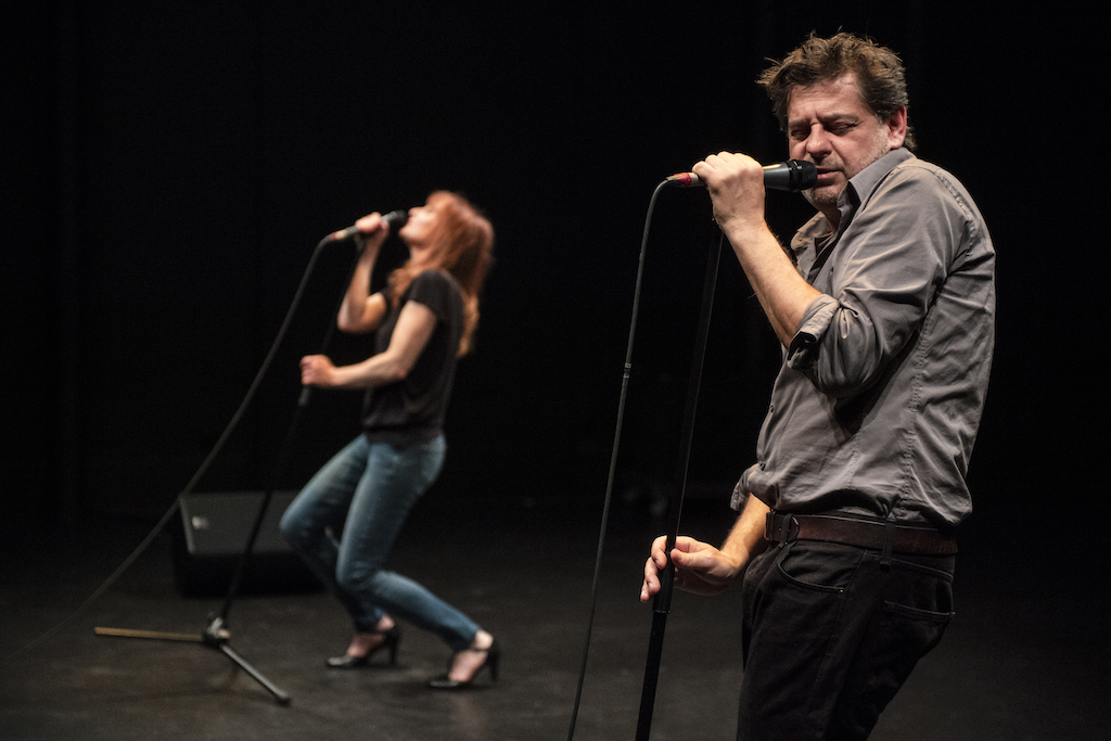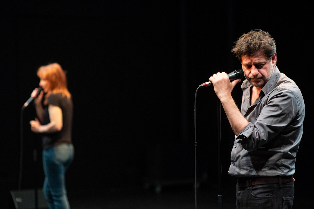 Valentin Rossier a adapté le texte de Fabrice Melquiot avec la contrainte de deux corps statiques, simplement placés devant des micros. Le résultat est étonnant de puissance et d’intensité, car les mots, doux, crus ou comiques, débarrassés d’une gestuelle mimétique, gagnent une valeur magistrale. Marie Druc, en jean et tee-shirt noir, est cette jeune femme à la blondeur énigmatique, Lisbeth au grand cœur et aux mensonges enfantins, idéal féminin de Pietr incarné par Valentin Rossier, poignant d’émotion et de pugnacité dramatique. Des nappes de musique électronique vont et viennent tandis que les sources lumineuses se font de plus en plus intenses. Le duo amoureux, sensuel avec les voix amplifiées par les micros, se fait duel, corps à corps bestial d’inconnus qui cherchent à s’entretuer. Dans un hôtel du bord de mer de La Rochelle se joue la plus antique des mises à mort : celle de la relation amoureuse de deux êtres qui ont peur de perdre leur identité, et ne se reconnaissent plus. C’est magnifique.