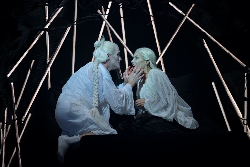 Le metteur en scène Thomas Jolly éclaire de manière impressionnante l’histoire et rend parfaitement intelligible chaque personnage dans son propre parcours. Ce travail de mise en lumière de l’opéra est le fruit d’une longue élaboration verbale avec le compositeur. La scénographie de Bruno de Lavenère et la lumière d’Antoine Travert procèdent comme souvent par une éventail de faisceaux blancs qui balaient et découpent l’espace de manière dynamique, jouant à cache cache avec un plateau tournant. Le château tangue, le ciel rougeoie, les arbres s’animent, l’orage déploie ses éclairs, et les personnages de ce conte dessinent leur trajectoire maléfique et sanglante dans des costumes à la blancheur immaculée et à la coupe parfaite (Sylvette Dequest). Cette mise en scène graphique est en parfaite adéquation avec le livret d’une subtile qualité littéraire et poétique de Frédéric Boyer qui navigue chez Shakespeare, avec quelques détours dans la Bible, les légendes écossaises ou chez Lewis Caroll. Le texte, en langue anglaise, est un hommage au théâtre, à la mise en abîme et à l’imaginaire sous toutes ses formes et flirte bien sûr avec la psychanalyse.