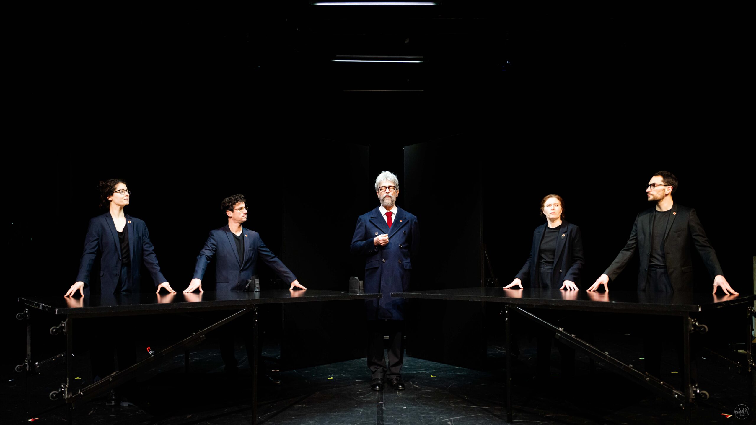 Comme dans Coupures qu’ils avaient présenté il y a deux ans, qui était une fable écologique, ce spectacle est né d’une enquête sur le phénomène de désindustrialisation et ses conséquences, après les affaires Alstom, Arcelor Mittal ou les FRALIB. Epluchant les rapports d’enquêtes de commissions parlementaires, questionnant les syndicats, rencontrant des acteurs politiques et des consultants en stratégie industrielle, les auteurs dessinent à gros traits des situations et des personnages qui mettent tout en œuvre pour ne rien faire, sinon exploiter leur revanche personnelle, au mépris des employés les plus démunis et du bien commun. Au centre du plateau, une batterie, comme un gros coeur qui pulse, devient le moteur de l’usine qui vrombit, le vacarme des manifestations, la roulade de tambours des apparitions ministérielles et des conférences de presse. Bien entendu, la caricature d’une syndicaliste qui ne décolère pas et ne tolère aucune contradiction peut faire sourire, mais les ministres et chefs de cabinets ne valent guère mieux, uniquement préoccupés par leur futur portefeuille et le rôle qu’ils auront dans la prochaine campagne.