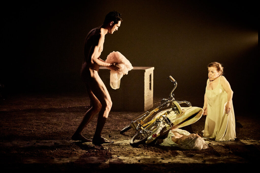 Il y a dans ce spectacle une suite d’images saisissantes de beauté, créées par d’incroyables jeux de lumières, clair obscur à la Caravage et composition de corps nus, languides comme ceux des premiers nés de la Bible. On songe au Jardin des Délices de Jérôme Bosh, pour la fantastique finesse et beauté des tableaux que les acteurs performeurs, gymnastes, de Mario Banushi, créent avec une grâce renversante. Quand l’un deux se déplace, le corps inversé, sur les mains, tel un chien errant sur un sol boueux, et mord le voile sublime qui enveloppe le couple de fiancés, unis comme Adam et Eve dans leur nudité magnifique. Lorsque la fiancée plonge violemment sa tête et son buste dans un cube d’eau, et qu’elle nous regarde, le corps ployé, les yeux noirs grand ouverts, avant de recommencer son suicide plusieurs fois. Quand deux garçons, rivaux, se battent au cours d’une rixe chorégraphique, avant de se réconcilier grâce aux femmes, la mère, et la fiancée qui revient à la vie.