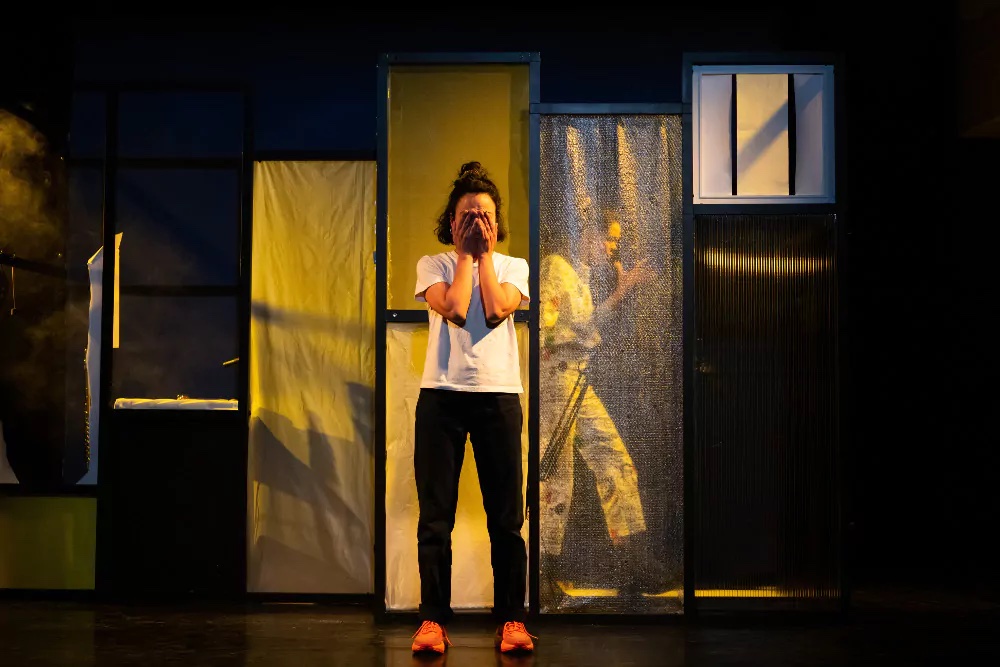 Tout débute par une séance de médiation, le noir se fait dans la salle, le public, tout comme Talia, ferme les yeux et est invité à se concentrer sur sa respiration. Cette introduction immersive nous plonge immédiatement dans l’action lorsqu’une fois les yeux ouverts, on découvre l’héroïne sur scène qui nous entraîne avec elle dans son dialogue intérieur. Intervient alors Taliabis, la voix dans sa tête, interprétée par une autre comédienne qui par l’ingéniosité du décor, nous fait face, tout en restant en retrait derrière de fines couches de toiles.