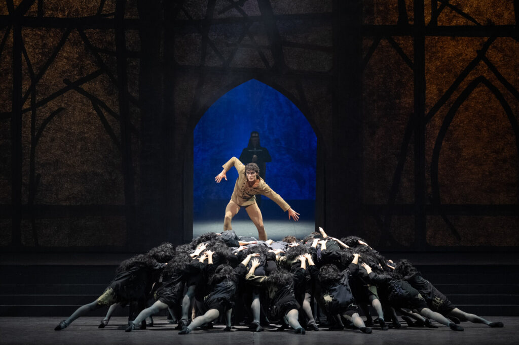 Dans un premier tableau saisissant, en l’an de grâce 1482, le peuple de Paris, bourgeois et mendiants, célèbrent la Fête des fous en rivalisant de pitreries et de grimaces les plus fantasques pour enlever le titre de « Pape des fous ». Les cloches et les clochettes en harmonie se déchaînent dans l’orchestre et introduisent subtilement la partition flamboyante de Maurice Jarre, gorgée d’influences mélodiques de Debussy, de Varèse ou de Messian. Le décor ombré d’une géométrie en noir et pourpre de René Allio dessine une ambiance d’un mysticisme ardent, vitraux poudrés de ténèbres qui annoncent le plus profond des drames. Et voici la danse, habitée et théâtrale, stylisée à outrance, du peuple de Paris qui apparaît comme une armée de marionnettes survoltées. Jambes écartées à l’horizontale, corps vivaces avec des bras et des mains qui dansent en permanence, tendues, écartées ou en forme de bouclier, les danseurs en ligne, comme sur des ressorts, déploient dans des costumes multicolores un enchainement hypnotique et enivrant. Survient Quasimodo, qu’incarne de manière stupéfiante un Hugo Marchand méconnaissable, les joues creusées, l’épaule droite surélevée et le bras à l’équerre.