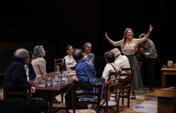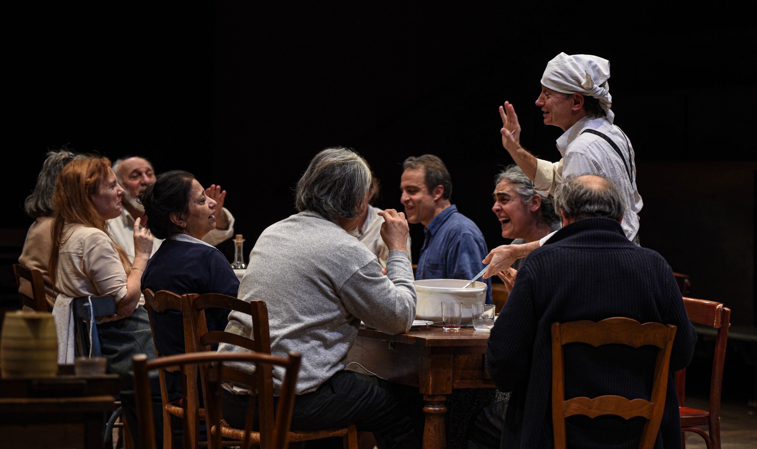 Richard les accueille chaleureusement, lui qui a fait le choix de rester en Amérique, tandis que sa femme fait le ménage chez des gens riches. Cet ancien acteur se charge de faire l’intermédiaire entre le producteur et la troupe et d’organiser la tournée. Autour de lui, des personnalités fortes. Olga Knipper, comédienne et veuve de Tchekhov, Vassili Kachalov, comédien avec sa femme Nina, Vania, Petia, Lydia, Masha, Lev Bulgakov et sa femme Varvara. Tous sont acteurs, tous sont engagés dans cette folle aventure, jouant devant des parterres de riches Américains ou de Russes blancs qui s’extasient devant le talent de la troupe. Leurs prénoms sont ceux des personnages de Tchekhov, qui s’est lui même inspiré de ses interprètes, et tout cela, concocté par la plume généreuse, fine et terriblement humaine de Richard Nelson, donne des dialogues d’une vitalité incroyable, d’une vibrante générosité, d’une proximité étonnante. Que font-ils au juste durant ce repas bien arrosé de Vodka, où des pirojkis bien dorés -fameux chaussons fourrés à la viande- sont servis avec des betteraves dans de belles assiettes décorées devant nos yeux ? La mise en scène très stanislavskienne a placé les spectateurs sur des sièges en bois, de manière quadri-frontale, tout autour de la table, et une sensation de familiarité, de proximité, dans les belles lumières de Virginie Le Coënt, envahit tout l’espace.