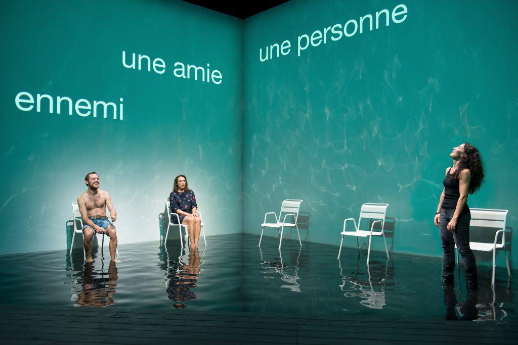 Les personnages d’Arne Lygre n’ont pas de nom. Ami, ennemi, relation, personne sont leurs seuls attributs pour cet auteur qui travaille selon des images mentales et les relations qu’entretiennent les individus avec les autres. Dans la belle scénographie de Stéphane Braunschweig, Virginie Colemyn et Chloé Réjon traversent l’étendue d’eau noire du plateau pour venir s’assoir prudemment sur une chaise en fer blanc. Les mots « personne » et « amie » s’impriment sur le bleu piscine de la paroi murale qui sert de décor, le spectateur est donc informé de leur relation, tandis que s’ébauche une conversation impressionniste entre les deux femmes. Un mari qui s’en est allé, l’amie qui devient sa nouvelle maîtresse, les sentiments contradictoires de compassion, de haine, de tristesse ou de regret émaillent les échanges, quand survient une autre personne.