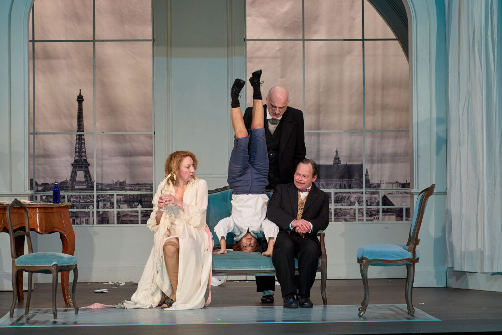 Emeline Bayart est impayable dans le rôle délirant de cette mère de famille sans foi ni loi, qui surgit telle une tornade rousse, la poitrine en avant et les rubans de sa robe de chambre qui volent autour d’elle, oiseau de mauvaise augure qui perturbe le prélude au déjeuner de Monsieur. Au centre de la pièce est posé le fameux sceau d’eaux usées, qui augurera tout à l’heure du pot de chambre en porcelaine incassable et de la constipation problématique de Toto qui a 7 ans et qu’il faut tant bien que mal purger ! Dans cette pièce que Feydeau écrivit après s’être séparé de sa femme, l’heure est au règlement de compte dans le couple, et le pot de porcelaine, jeté à toute force contre un mur, se brisera avec autant de violence que se morcèlent les relations conjugales, minées par la soudaine révolte des femmes, bien décidées à reprendre le dessus dans leur foyer que leur mari a souvent déserté. Entre le 19° et le 20° siècle, les moeurs se libèrent, l’éducation des enfants se généralise et la société bourgeoise explose d’adultères et de désirs qui se libèrent.