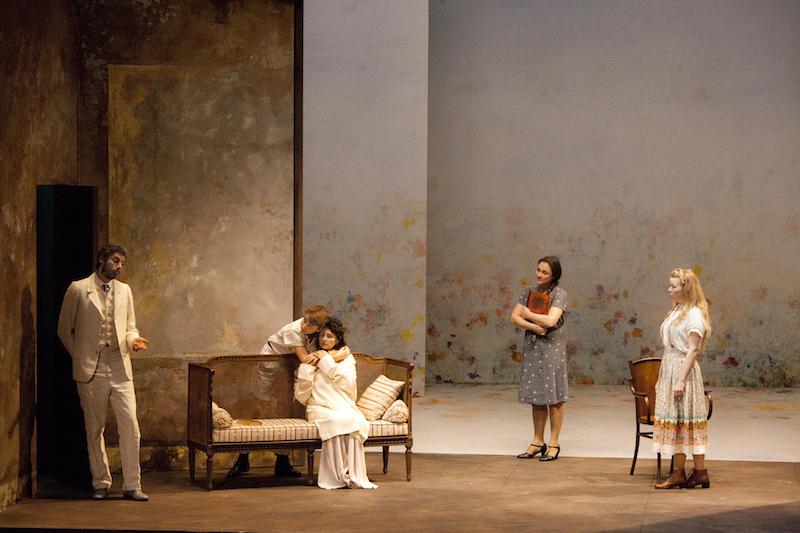 Des toiles peintes (Jacques Gabel) aux couleurs pastel, rose, vert, ocre, figurent les vieux murs d’une grande maison de campagne dans la belle lumière de Joël Hourbeigt. Un banc, un canapé, peu de meubles, mais des acteurs formidables. Anouk Grinberg, enveloppée dans une robe fourreau de coton blanc (costumes très réussis de Marie La Rocca) incarne Natalia, une maîtresse de maison romanesque qui s’ennuie et passe son humeur taquine sur son ami et confident Rakitine, amoureux de la belle, mais qui ne tarde pas à s’apercevoir qu’elle a les yeux ailleurs. Micha Lescot nous régale de son personnage de dandy d’une élégance folle, qui passe son temps à philosopher sans jamais passer à l’action. Anouk Grinberg est tour à tour insupportable et attendrissante, acide ou pitoyable, géniale de sincérité et de rouerie face au tsunami sentimental que provoque l’arrivée du jeune Beliaev.