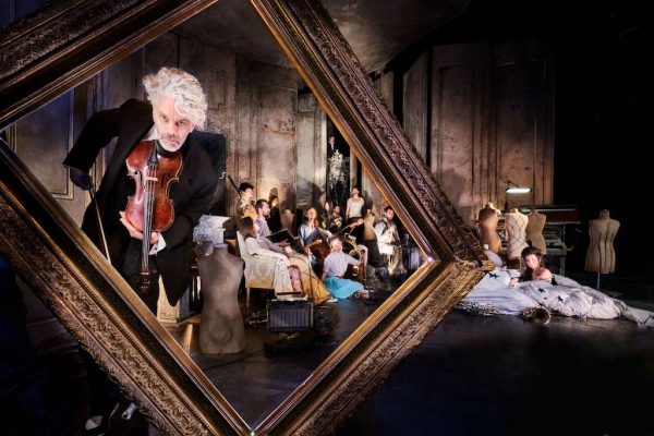 C’est une chambre d’enfant grandeur majuscule qui nous est ouverte en pleine lumière sur la scène, découpée par les ombres magnétiques des personnages et des objets qui viennent la déchirer. Dans cette chambre, nul ne tient en place. Le héros chaplinesque vrille sur place, se déstructure comme un pantin désarticulé avant de se jeter sur un parapluie ou se précipiter tel une fusée à travers le cadre d’un tableau. Une aérienne danseuse surgit en glissant sur le sol avant de se contorsionner comme un chat, une autre plus costaud se lance dans un enchaînement de break-danse au niveau impressionnant, puis tout s’emballe, la musique gronde ses accords stridents de violon suraigu, comme la houle d’une tempête shakespearienne à laquelle aucun navire ne résiste. Est-on au théâtre ? Ou sur un tournage de Fellini ou le burlesque le dispute au grotesque ? Et que vient faire Alessio, contremaître ou régisseur à l’allure de geôlier du théâtre avec son gros trousseau de clés sonores qui pendouille ? Les portes, les murs se meuvent avec la légèreté des toiles peintes, alors qu’un piano à triple clavier semble jouer tout seul.