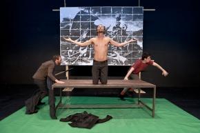 Une bâche vert fluo au sol, qui rappelle les scènes de cinéma tournées avant l’ajout des effets spéciaux ; un radeau de la Méduse fait de photocopies scotchées les unes aux autres, comme pour signifier le naufrage bancal de la famille d’Orgon avec l’emprise exercée par Tartuffe sur le maître de maison : un autel de bric et de broc, qui évoque la religion de pacotille pratiquée par le faux dévot ; une bougie que les comédiens se passent comme un relais, et qui, chaque fois qu’elle s’éteint, déclenche toujours les mêmes exclamations – “Feu !”, “Lumière !”, “Molière”, comme si la pièce faisait une pause avant que la lumière ne se rallume…