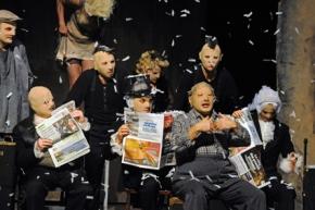 Maîtrisant à perfection les procédés de distanciation qui forment la théorie brechtienne, les comédiens excellent tous, dans un ensemble qui fonctionne à merveille. Apartés marqués, visages tournés vers le public au moment de s’adresser à un autre personnage, chansons en chœur ou en solo… La dynamique de troupe crée celle de la pièce, et chaque comédien, le visage revêtu d’un masque de silicone pour marquer la forme de son crâne, se donne corps et âme à une production qui touche au sublime dans sa mise en scène du grotesque.