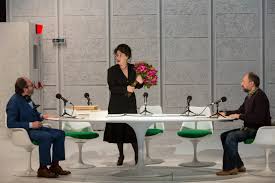 Nous sommes dans un studio d’enregistrement d’une station de radio. Le journaliste critique et un artiste peintre de renommée mondiale se font face, chacun assis à un bout d’une longue table ovale blanche. D’ailleurs, tout est blanc, les murs ainsi que la lumière. Bien que rôdé à l’exercice de l’interview, le journaliste, ici Hervé Pierre, tellement touchant, vif en ses rondeurs et arrondi quand il incise, peine à lancer son invité. Il connait pourtant bien son œuvre et il s’est informé en long et en large des événements de sa vie, mais l’artiste qu’incarne brillamment Denis Podalydès ne consent pas facilement à se laisser démasquer. Ce tête-à-tête donne lieu à de savoureuses railleries sur les journalistes tout en étant parsemé de pertinentes et non moins savoureuses considérations sur l’art et l’acte créateur. Puis soudain le miracle se produit. Tandis que l’invité commence à évoquer les figures qui ont compté dans sa vie, celles-ci reviennent telles des fantômes et elles vont occuper le plateau les unes après les autres, se lançant dans de longues partitions solo qui reconstituent le passé.