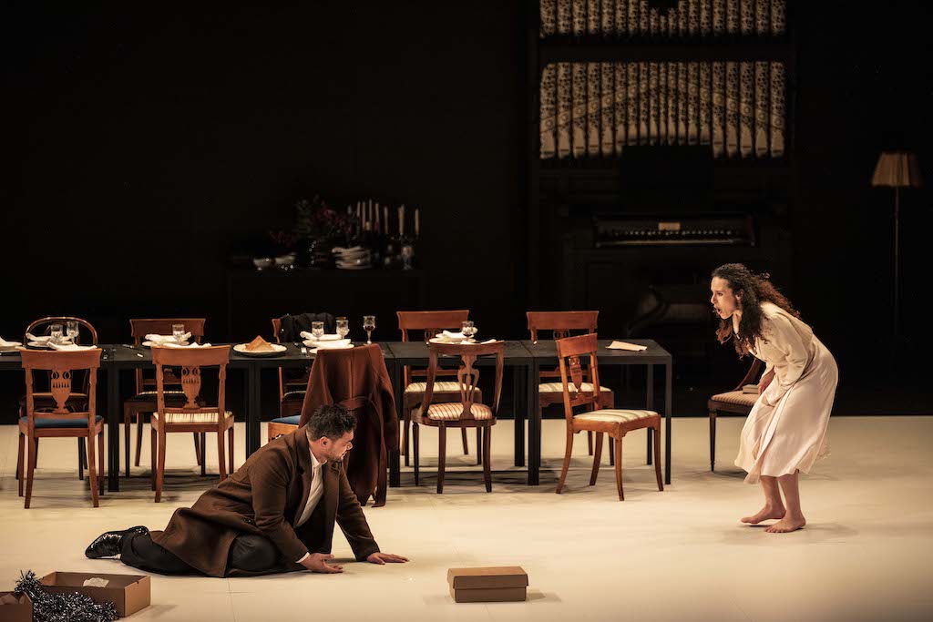 Le reste de la distribution est à la hauteur de l’exigence musicale, avec John Chest dans le rôle du mari Albert, Christian Immler dans celui de l’autoritaire Bailli, Jean-Christophe Lanièce et Carl Ghazarossian jouant les compères Johann et Schmidt. Toute cette petite société, avec les enfants solistes de la Maîtrise populaire de l’Opéra-Comique, évolue dans un décor unique, mur noirs qui laissent à mi-hauteur s’échapper la cage de scène, table et chaises pour les repas, orgue pour l’église le dimanche matin. La lumière intense de Bertrand Courderc inonde le plateau, comme pour accentuer le contraste entre l’intensité secrète des sentiments et la franchise d’une vérité qui se dévoile. D’ailleurs, la salle elle-même reste éclairée, comme si nous devions rester les témoins du drame. Il n’est pas certain que l’extrême sobriété d’un décor unique, cette lumière appuyée et les costumes à l’élégance empesée fassent le jeu d’une intensification de l’émotion. Mais le chant et la musique emportent tout, et le public conquis fait une ovation aux interprètes.